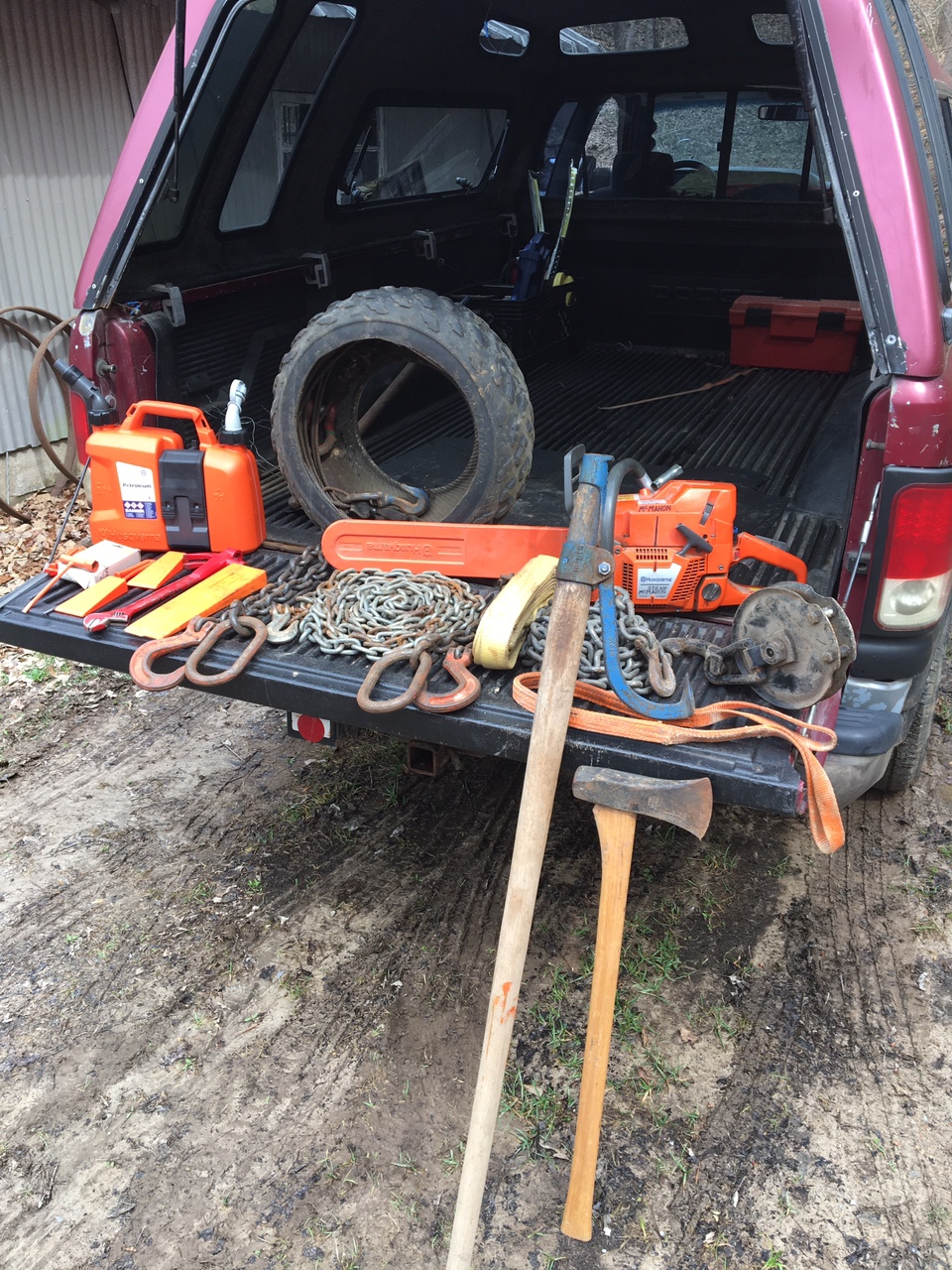 Gas and oil for chainsaw. Container also carries saw wrench, round and flat files, sharpening guide, extra chain, and two wedges.