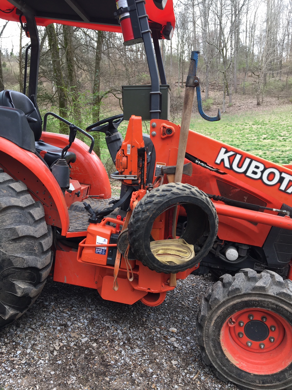 Holds everything well. Most of the time will just be couple of chains and sometimes the saw. Tool inventory will change to match the job. Much safer way to carry tools while working with the tractor.