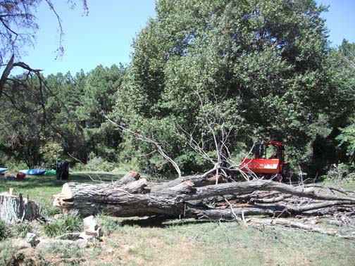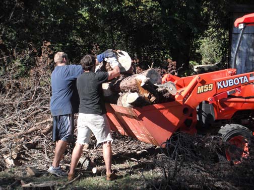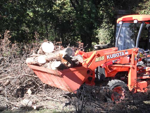 I use my backhoe to lift the wood for cutting. Why bend over or worry about hitting dirt or a rock with your bar. Just simply lift, cut, and let the wood fall into a trailer. Of course that main truck is a little large.