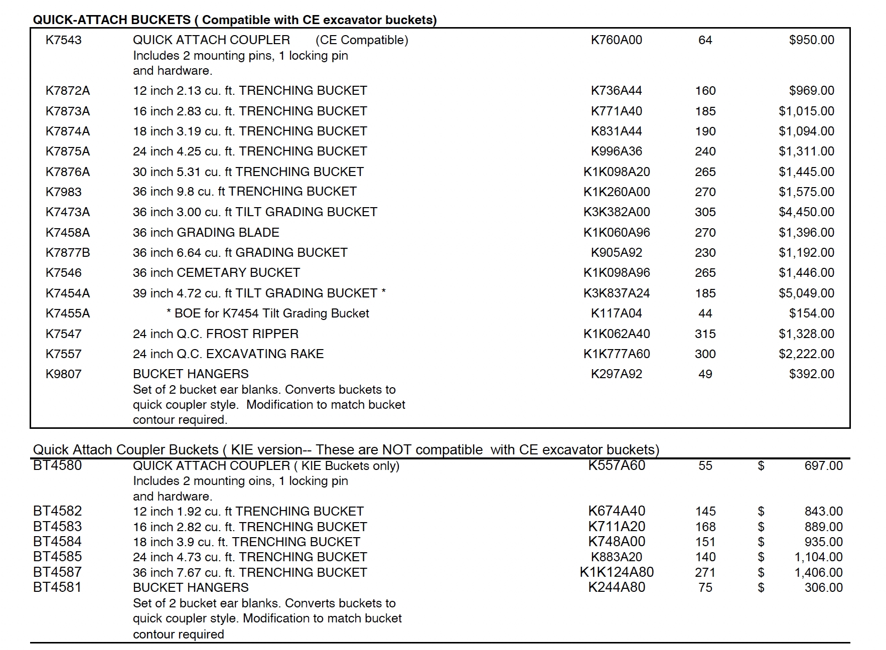 It lists the prices from Kubota for all the TLBs and all options with part numbers. For example, below is an example from the 2019 "Wholegoods" showng two different options for M62 Quick Attach backhoe buckets. I see a tilting grading bucket.... nice.
