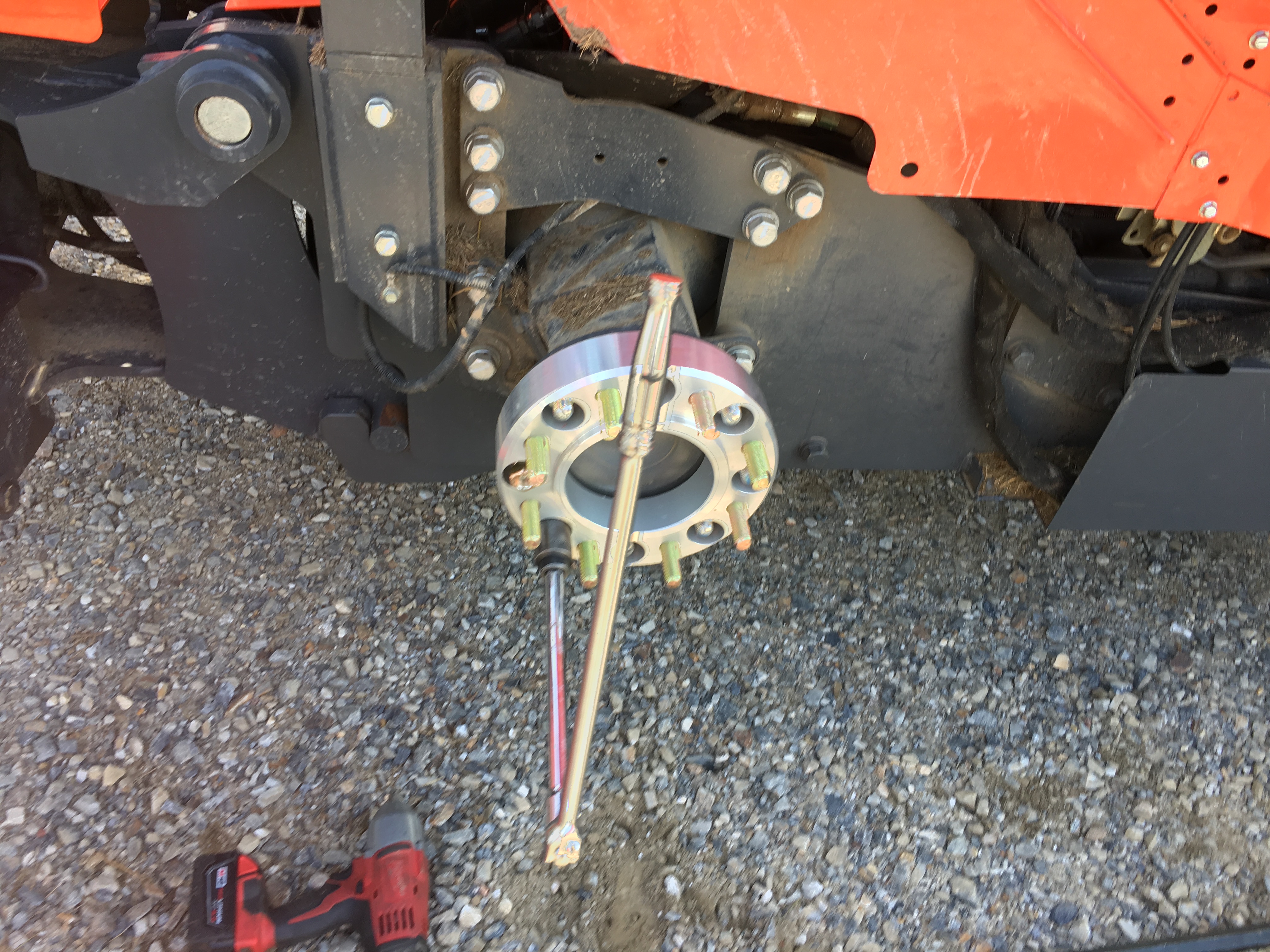 Richard @ Bro-tek is where I bought mine, they were $450 delivered for the pair, it includes a set of lug nuts & lug bolts. Which brings ups a point, each OEM threaded stud & nut from Kubota is $60 & my first install with an impact driver I boogered up 3 or so threaded studs & nuts. the spacers are aluminum, 2" thick & due to the size of the OEM lug nut it sorta limits you on how you can installl. The hardware from Bro-tek is high grade so you can use anywhere on the installation. My problem was after my 1st install I was running minus 2 lug nuts & a couple more were seized. So my second install I removed all the threaded studs & replaced with Bro-tek's lug bolts, these hold the spacer to the hub, then I used the OEM lug nuts to fasten the wheel to the spacer. This was a lot of work using a 3/4" drive manually, I wouldn't use an impact unless you have extra hardware for the ones that get boogered up.