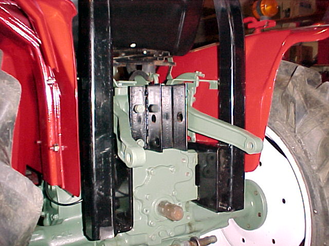Here's where it attaches to the trans case, same way as Yanmar does it. I was concerned that the lift bars were going to hit the support bracket, but it just clears with about 1/8" all around! The other brackets I might add are angle brackets that bolt in the exposed holes on the back of the case and then will bolt into the open area on the support behind the case