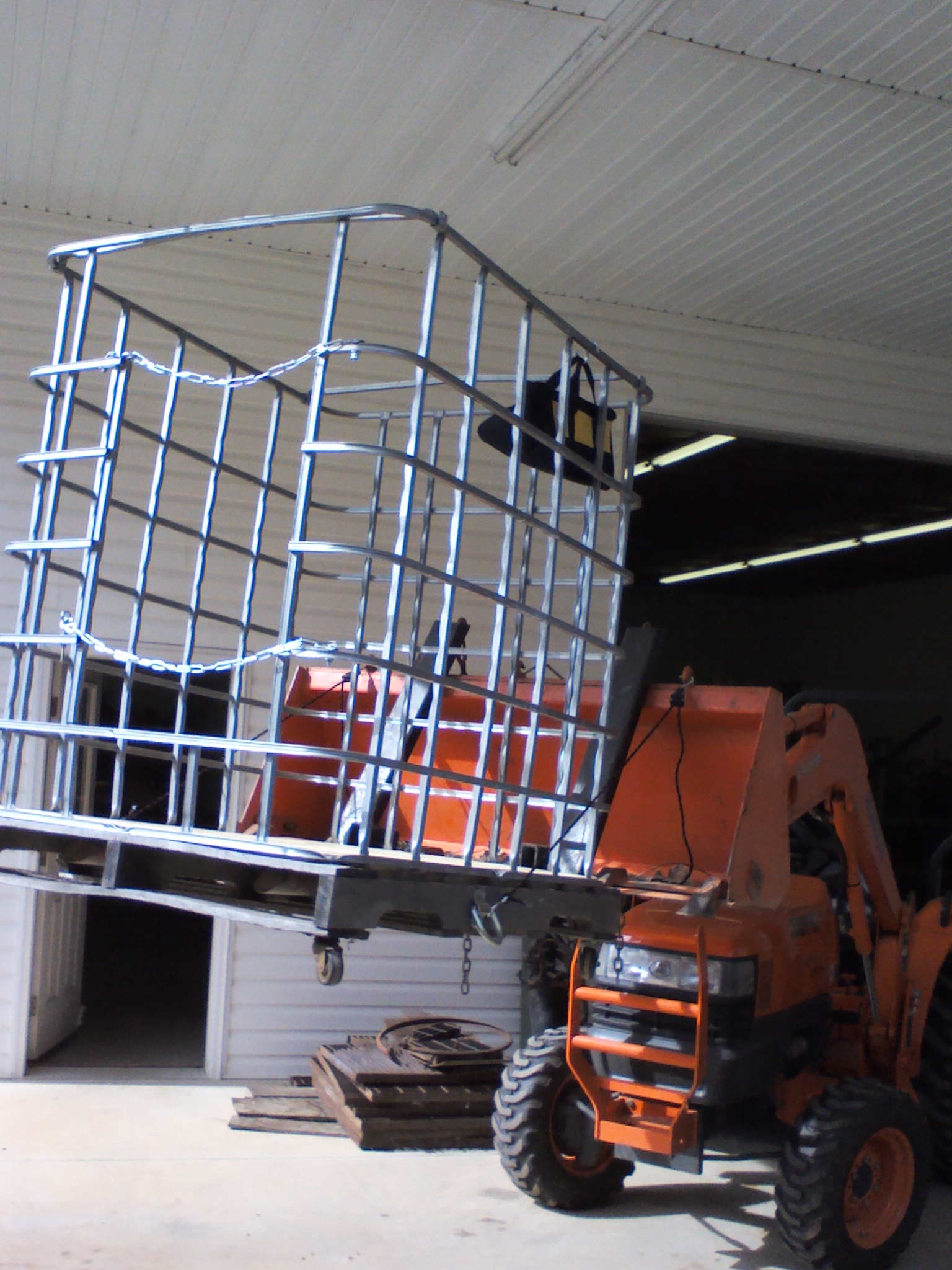 In simple terms, I simply unbolted the aluminum frame from the plastic base and threw away the plastic tank. Took a 36" x 48" pallet, decked it with 3/4" plywood and mounted the aluminum fame. Cut out a doorway and added safety chains, put wheels on the pallet for easy moving around when not on the tractor, and added a couple of healthy D-hooks on the side to prevent dropping the rig accidentally. My total cost was about $50; $35 for the tote, $8 for D-hooks and used salvaged chain and casters.
