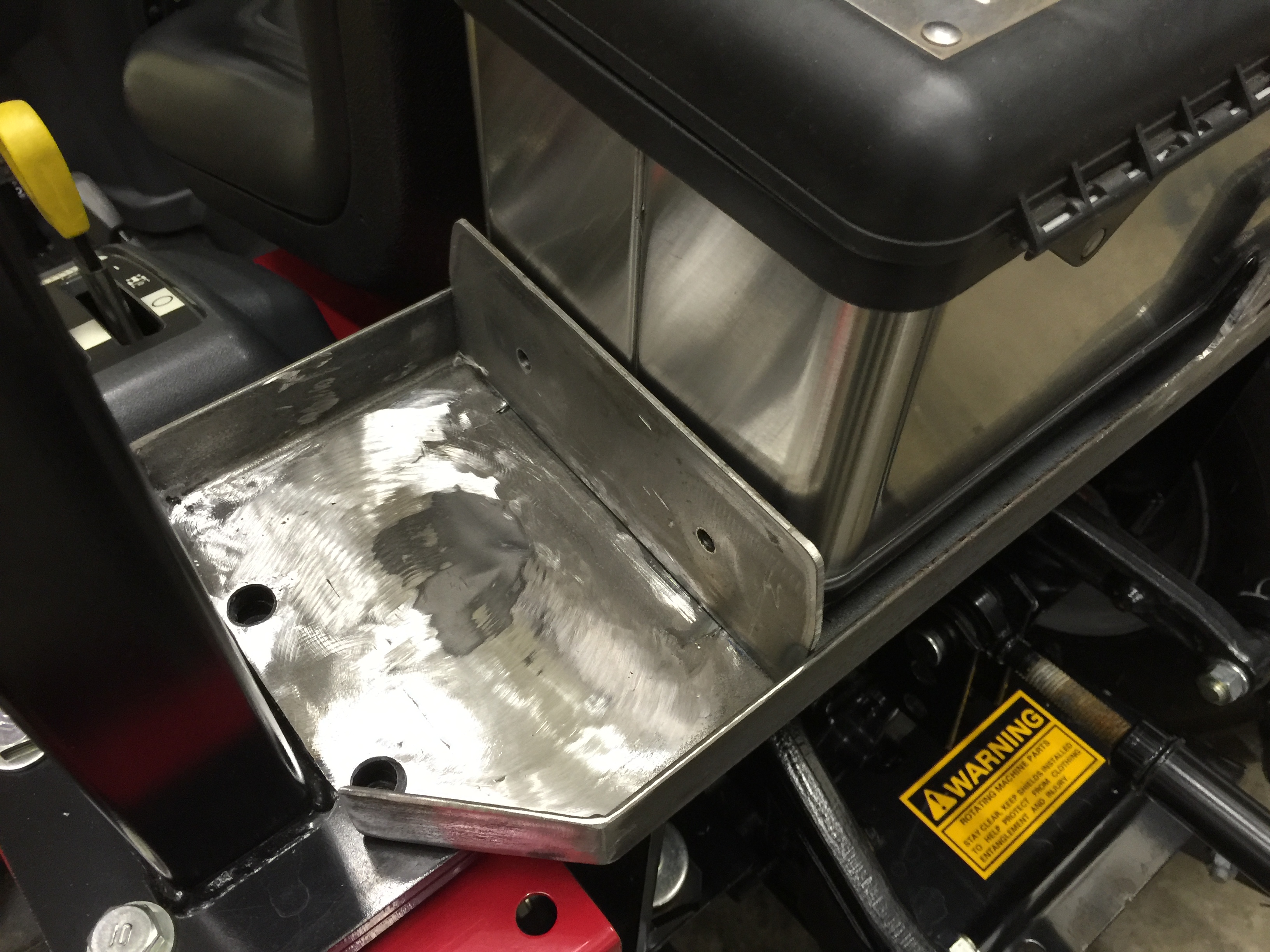 I picked up a small stainless box from HB. Made a platform that goes in between the 4 inside bolts on the rops. Still working on way to add a cup holder and parts try as a all in one unit. But it works great and no modifications to the tractor. Seat does not hit even when all the way back.