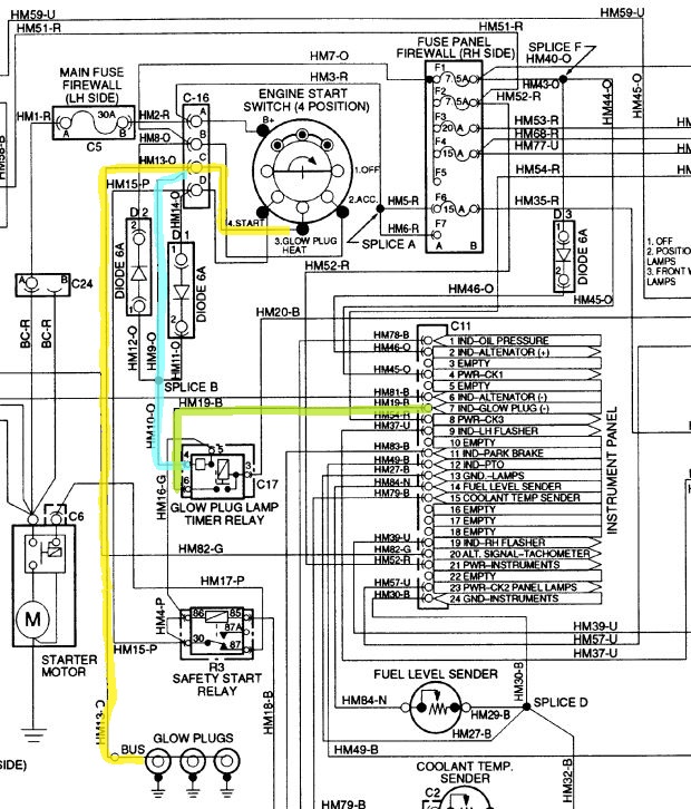 The glow plug circuit is marked in yellow, the glow plug timer circuit is in blue and the circuit to the indicator lamp is in yellow.