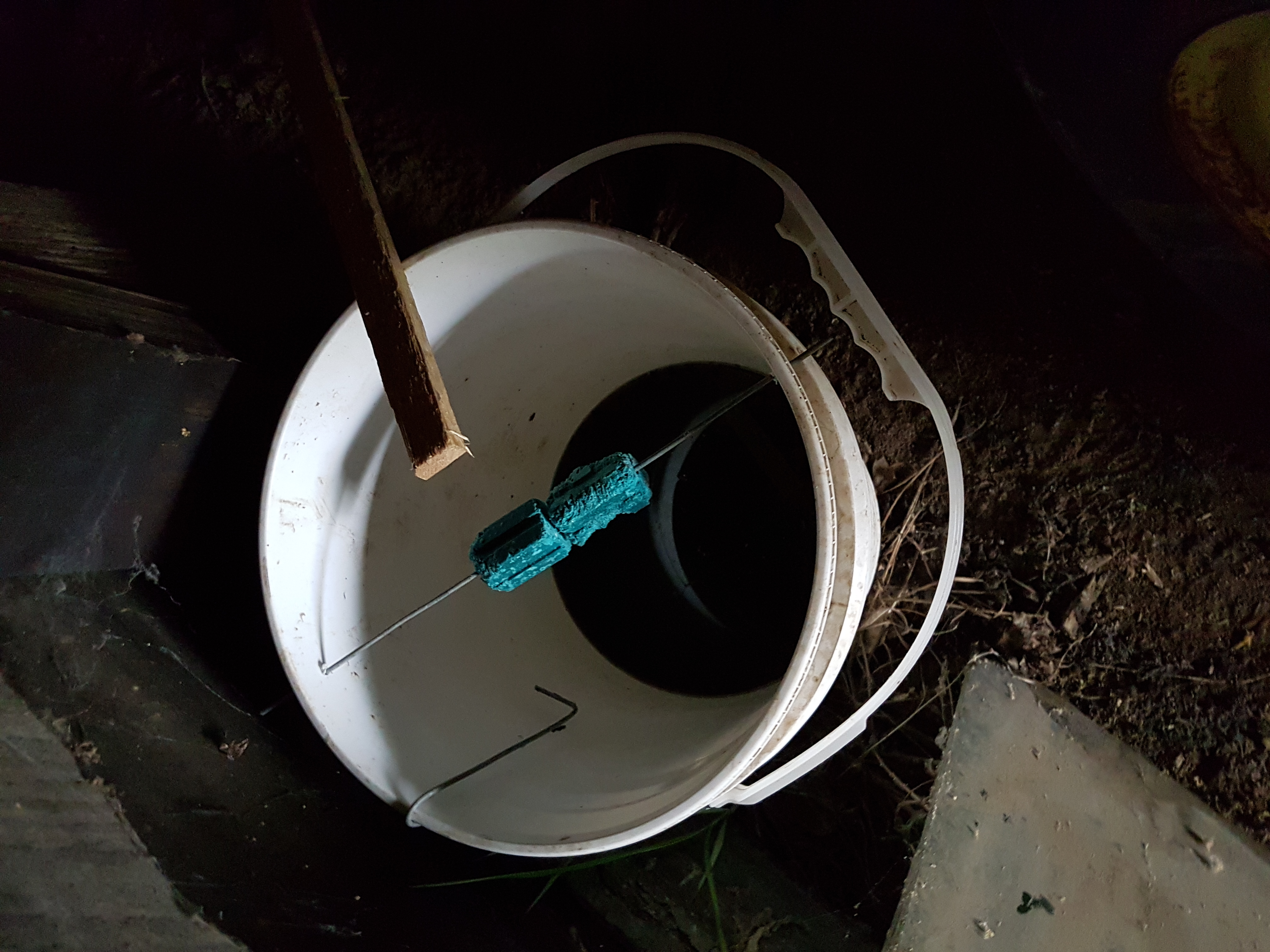 So this is what I use for a mouse trap. It's just a recycled oil pail with holes drilled for a wire. The stick is about 4' long and I keep about 3 - 4" between the end of the stick and the bait. Inside a heated building water is ok (antifreeze doesn't evaporate as fast as water) but outside I use old antifreeze. One pail is good for about 600 square feet of building as the mice seem to be attracted to the bait. I clean out the dead mice about once a month. More often in summer and less often in winter.