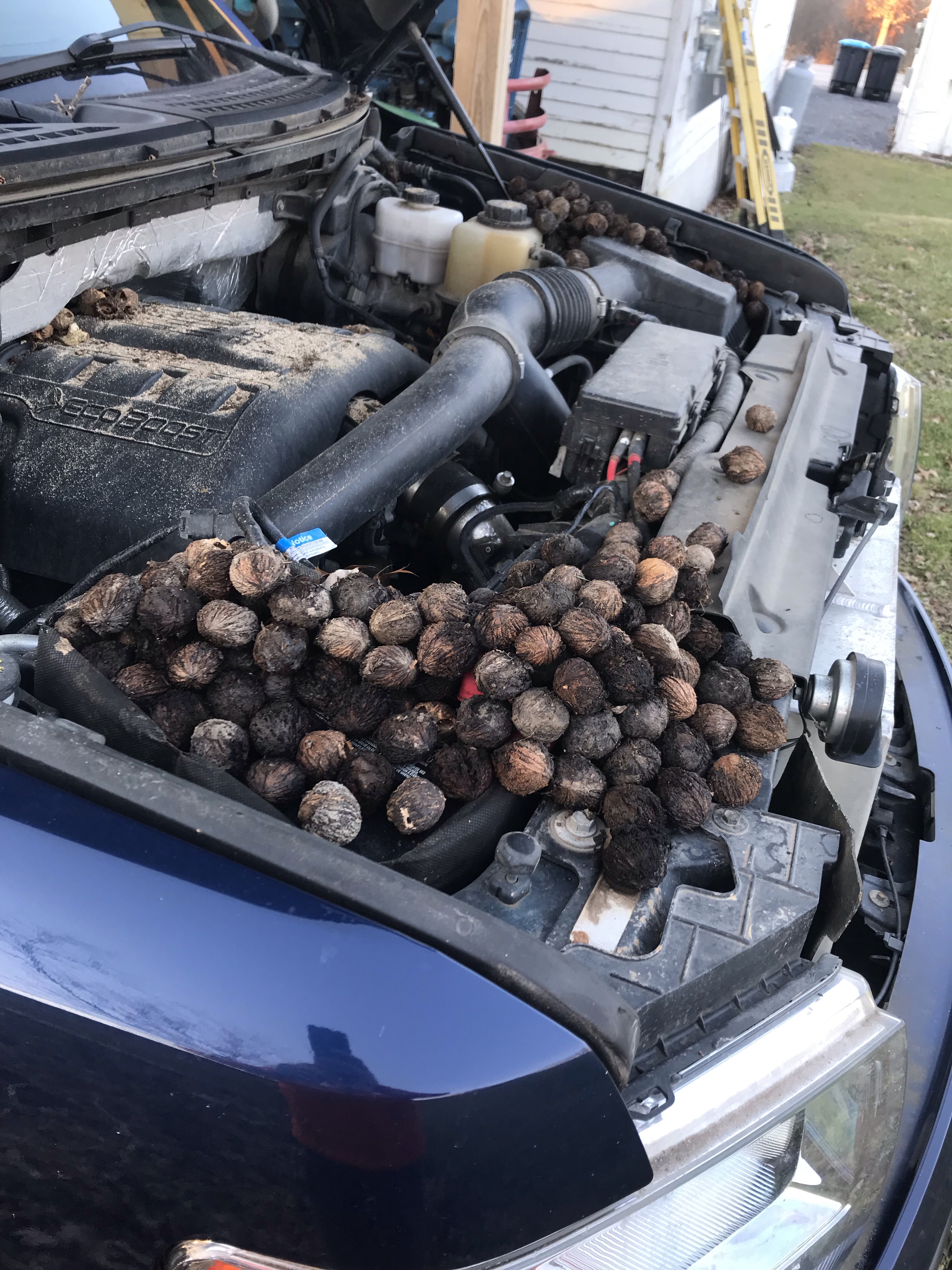 Pulled over and found that they had now stored nuts in the electric fan shrouds. When they turned on, blades ripped off, something jabbed the radiator, and destroyed the fans.