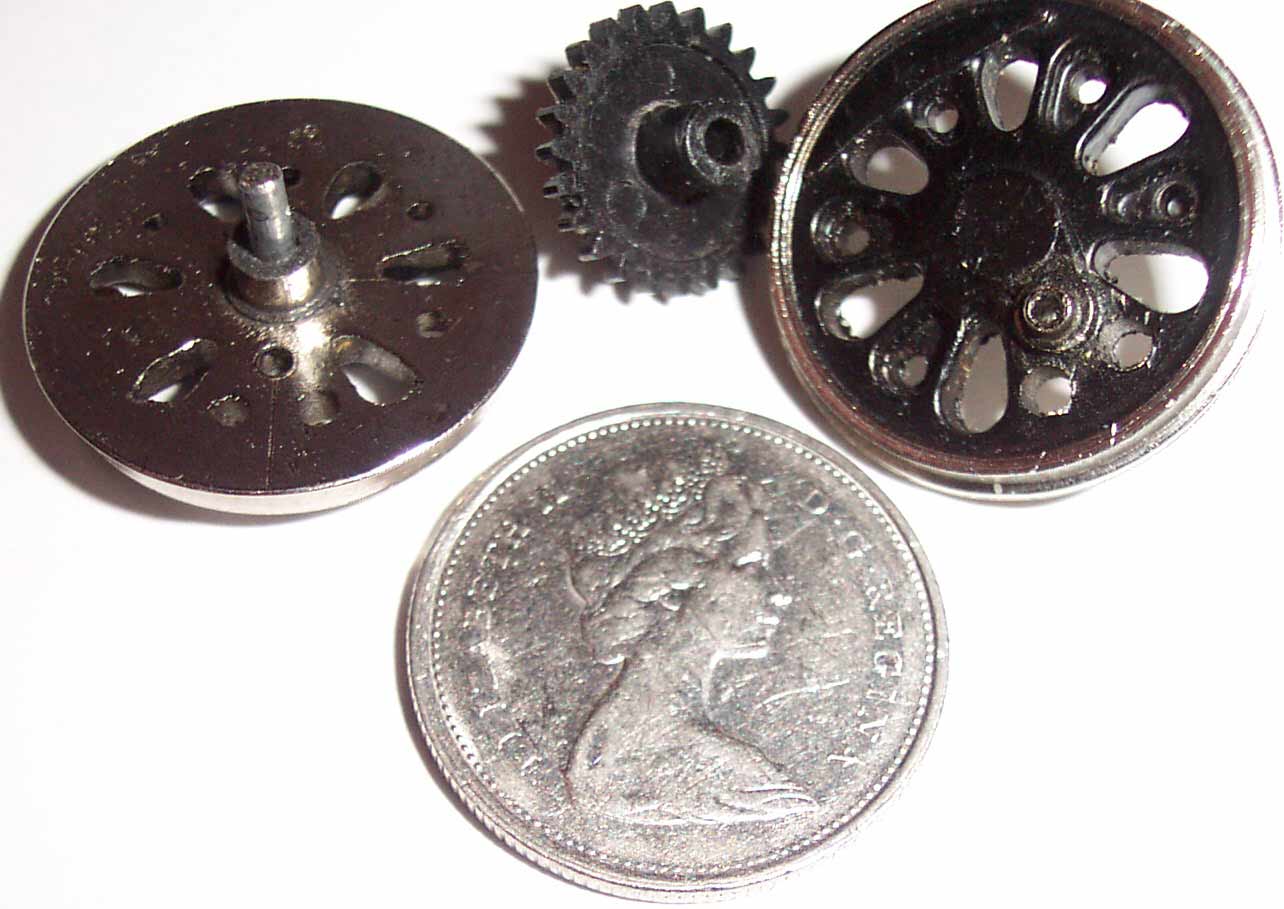 The models work in a similar way as the prototypes, with one major difference. The real ones were driven by steam pistons whereas the models have electric motors. On both, power is initially transfered to one axle and then side irons are used to transmit power to the other drive whels on the same side of the engine. In order to have a reasonably smooth running locomotive, the driving wheels have to be quartered, meaning that the drive wheels have to be oriented so that the dowels for connecting the side irons are exactly ninety degrees apart from each other. In the models there is a drive gear in the middle of the axle between the two drive wheels. All driver axles are rigid, so power applied to a drive wheel on one side also provides power to the other drive wheel on that axle. As a result the axles are always getting power from one side or the other. So you end up with a sequence such as: push left, push right, pull left, pull right. This only works if the drive wheels properly quartered, otherwise the mechanism works against itself.
