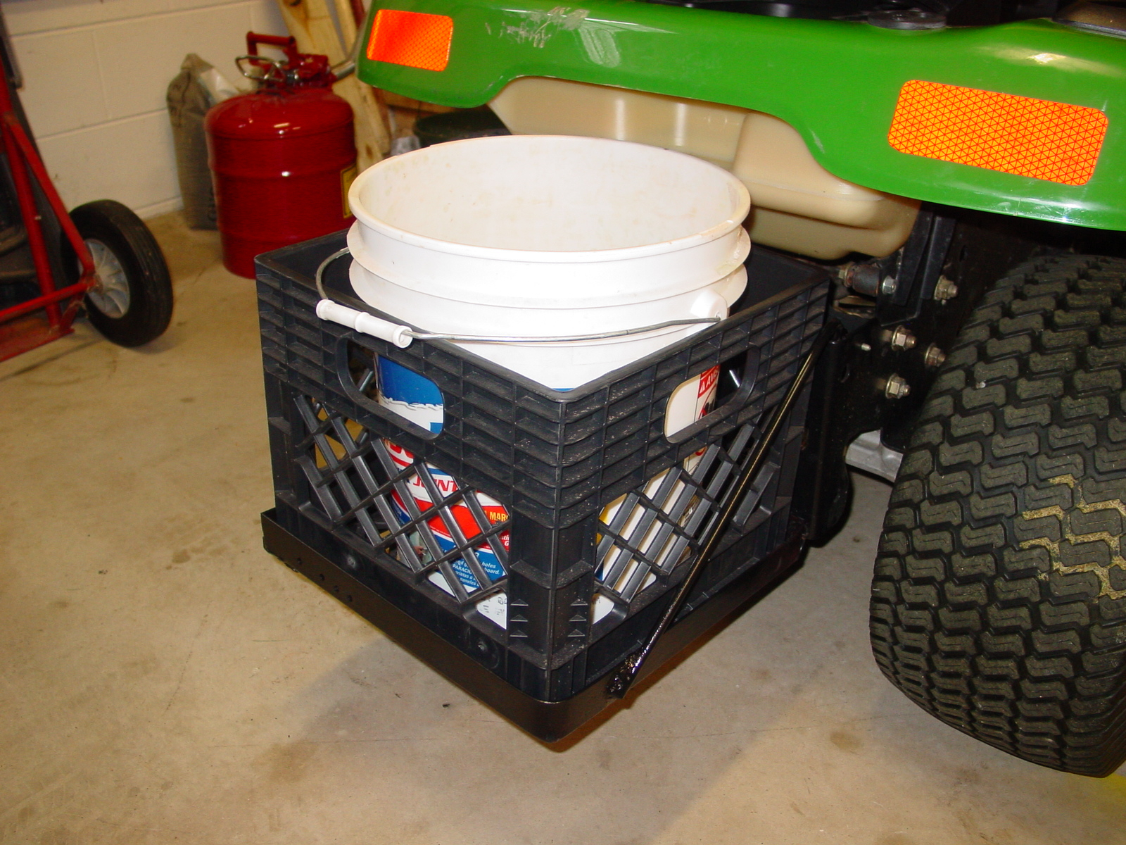 I did the same thing to an Ariens rider that I use for a yard utility vehicle. Bolted a milk crate to the back. I also attached two short sections of PVC pipe to the back of the milk crate that holds a can of bug spray and a can of bee spray. I'd be lost without it.