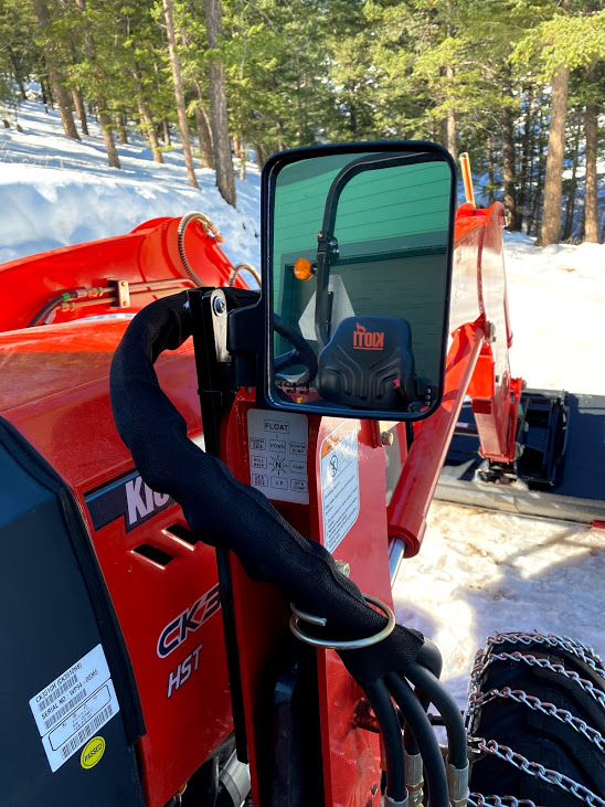 That is a great mirror. I was considering a rear mounted tractor camera, but it seems like overkill and it's nice that you can just reach over with a rag if it gets fogged up.