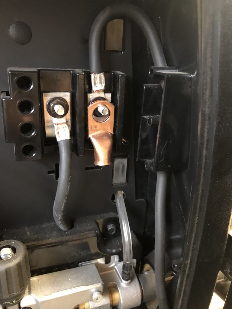 Option 2: I could increase the wire gauge to 2/0 and I think it will actually fit the routing and terminal inside the welder. Really didn't want the expense of a 15ft wire. I actually bought a second terminal in case I mangled the first one. See pic.