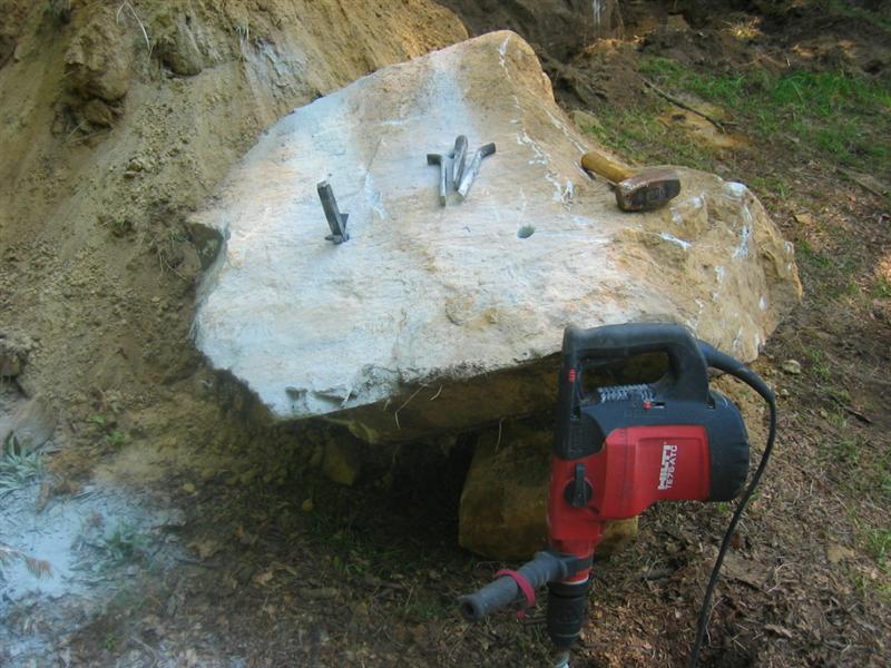 More pictures. I drilled two 1" holes with a hammer drill and pounded in the plug and feathers. Notice how I use the hand-held mini sledge, don't need to kill it with force. The next post will show the rock split up.