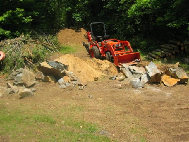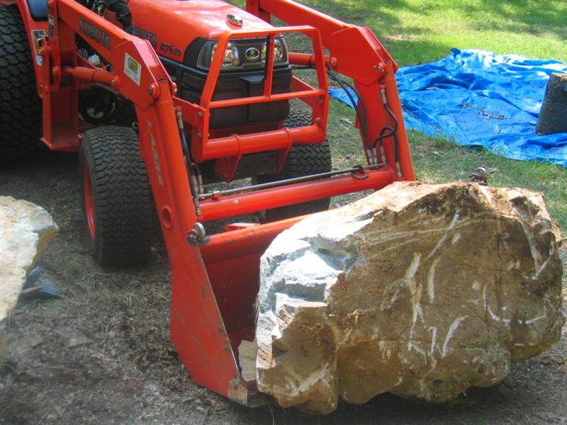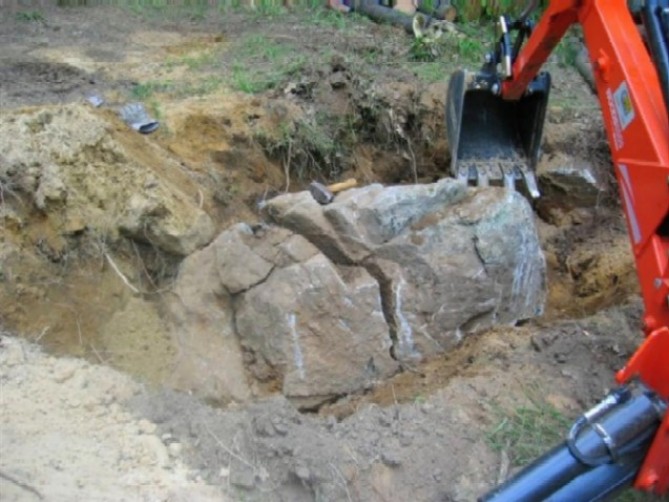 I was able to pull this piece out of the hole with the hoe but could only use the FEL to push the rock around. I split it up with a sledge hammer because the plug & feathers put some cracks in the rock that I was able to work.