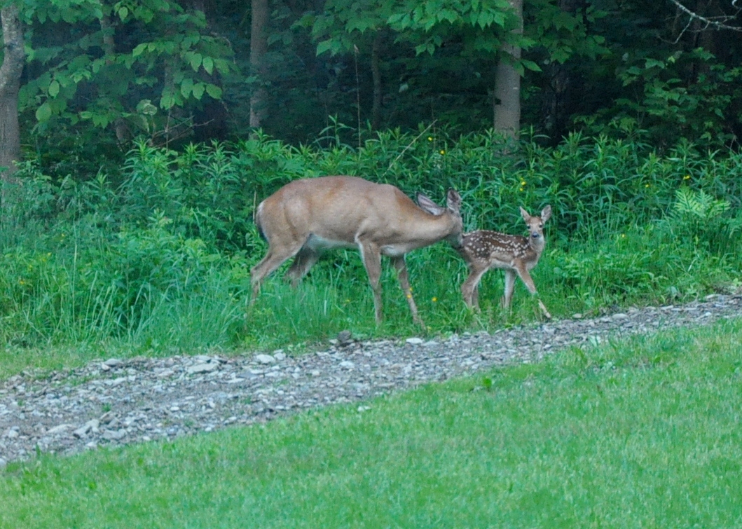 Here are a few fawn and mama pics from the other day. The little one was doing sprints back and forth and then would cuddle under mama and take a drink. My wife and I had a great time watching the show. Pics aren't real clear because they were through my window. The little one was playing just like a young puppy!!