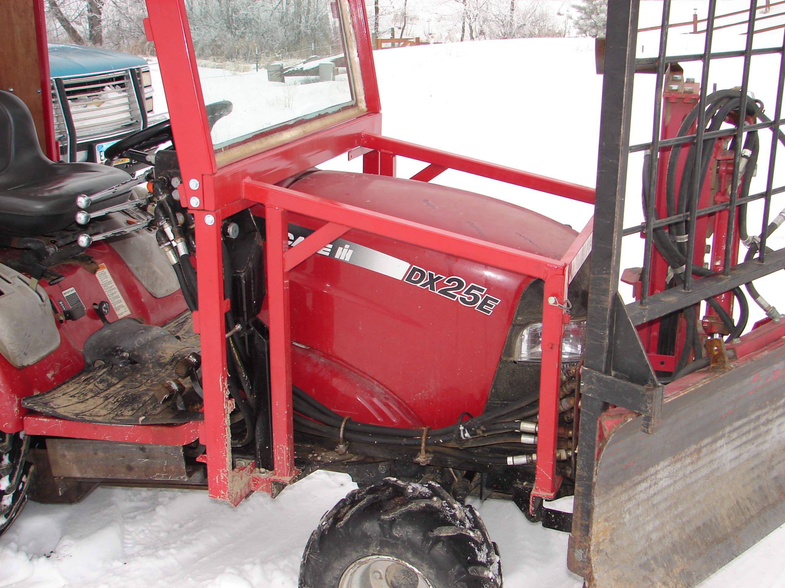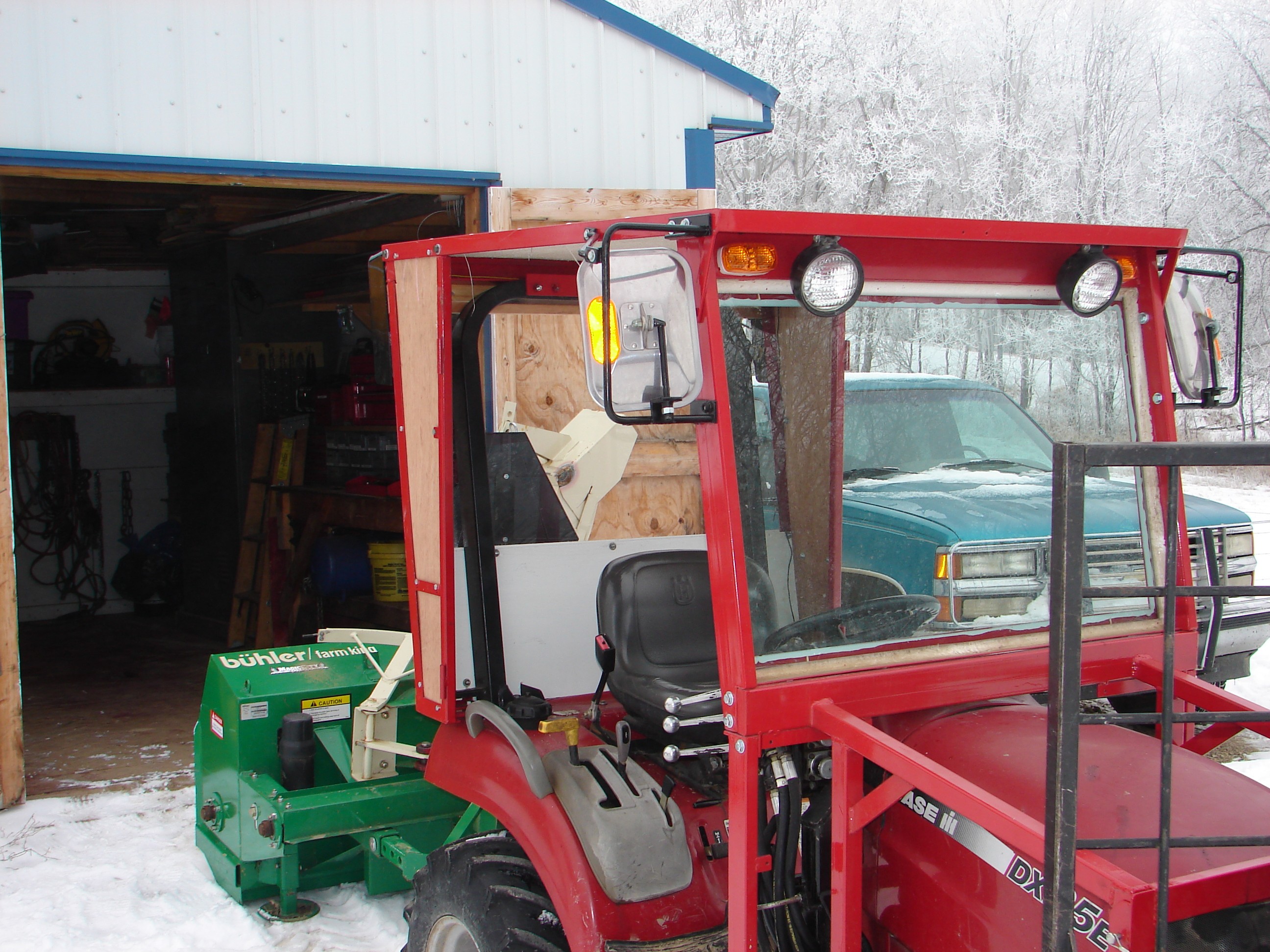 The cab is made quite strong for small trees 6" or smaller to fall on it. Safety glass in front, plexiglass in rear. The cab is unfinished and in progress. Another picture shows the engine guard. This is so trees falling or scraping will not ruin the hood. Another picture shows the underbelly guard. This is needed to prevent the drive shafts, hoses and other items from being ripped off or bent while going over brush and small trees. This belly pan quick detatches in the same manner that the tractor's belly finish cut mower does. Another is of the mirrors, they are in a braced guard to prevent trees from ripping them off.