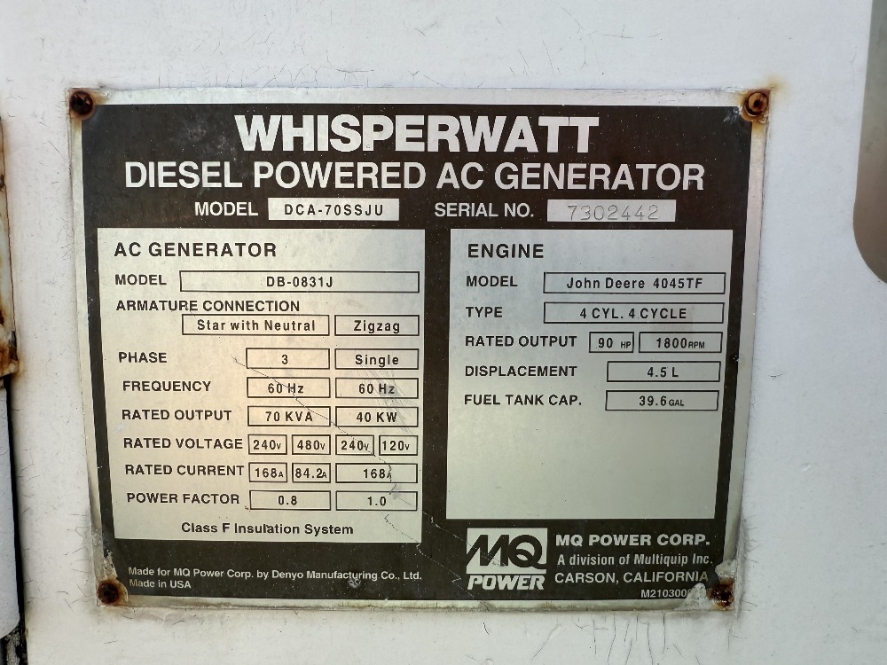 More information, additional photos and/or videos may be available on our website: #1235A - MQ Whisperwatt DCA-70SSJU Generator