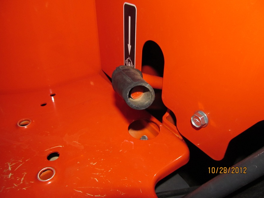 Now, here's a sort-of solution. I found a piece of soft rubber hose, cut it and slipped over the edge of the lever and it helps a lot. I'm still not real happy and might try to wrap in leather or something softer. I think the rubber thing I used is a sprayer drop tube. Found it in the road near the house and it fit like a glove. Still, it abrades my boot a little. Here's what the hose looks like on the lever.