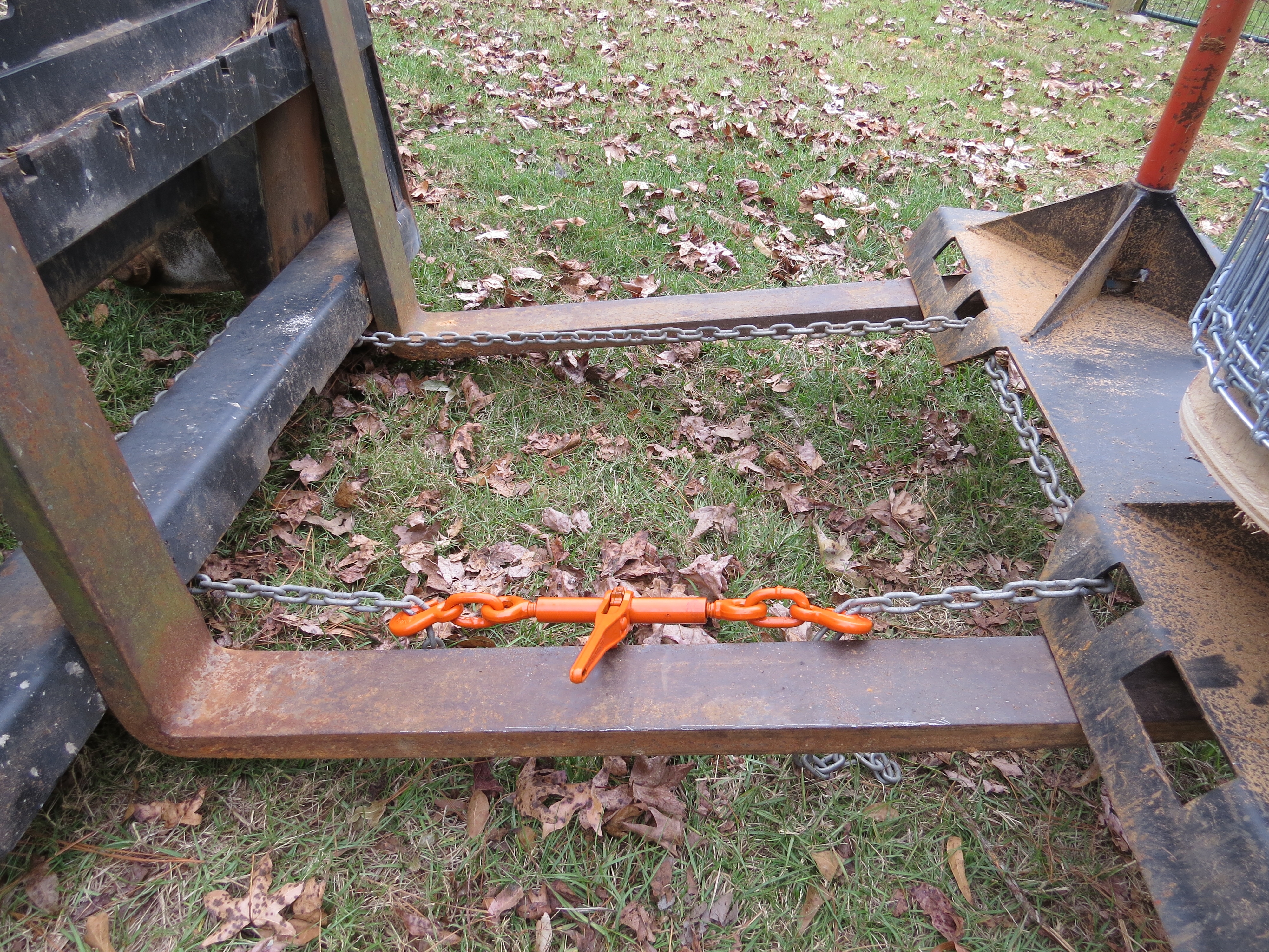 I use two come-alongs to stretch it. The strap one is super long and it allows me to find something to anchor it to up high on the backhoe. The cable one needs a chain, it' short, but more powerful, and it goes on the bottom where I can attach it to the frame of the pallet forks.