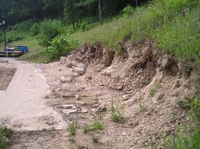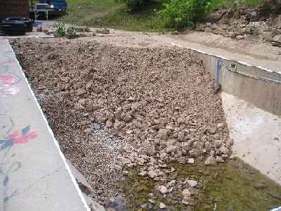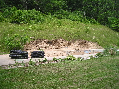 Another view of where the dirt is coming from. The bank got to be above the height of my 180, so I decided to start my retaining wall, where the rocks are lined up. I plan to build that up about 3 feet, and start digging again.