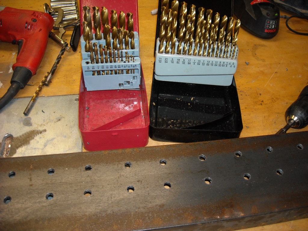 Using my new cheapo HF DP, I clamp on a guide, prop it up on some rollers I made, and slide it from hole to hole. I use WD-40 to keep the bit cool. And I have found these $15 HF drill bit sets to be very good. Just don't burn them up and they will last a long time. First hole was just as easy as the last on an already used 3/8" bit. After the first row I realigned the stop block for the second row of holes. Just used a speed square and soap to mark the location.