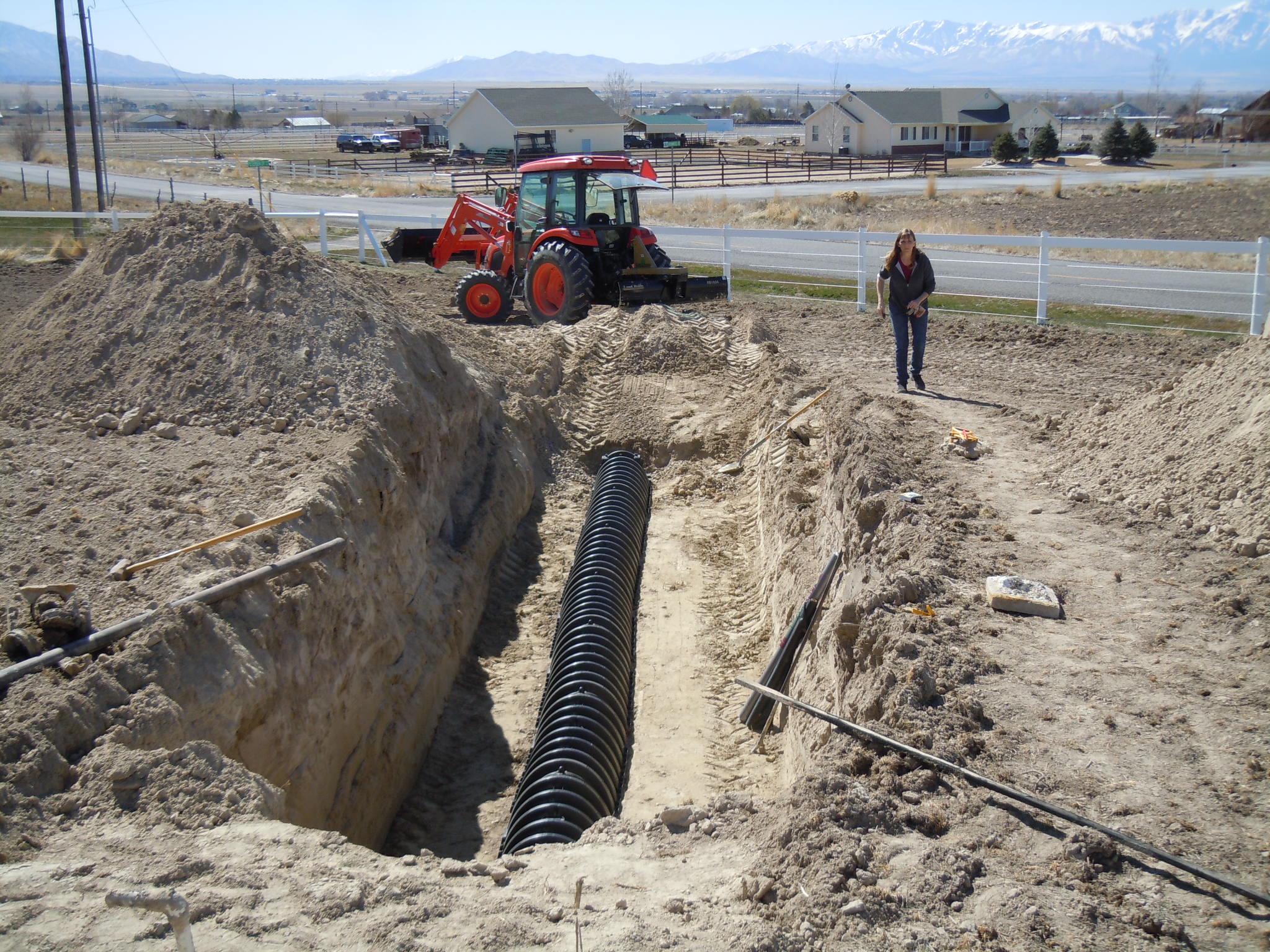 Dug the whole leach line up with the FEL in about 2.5 hours. The deep end was about 7' deep - low end about 3' deep.