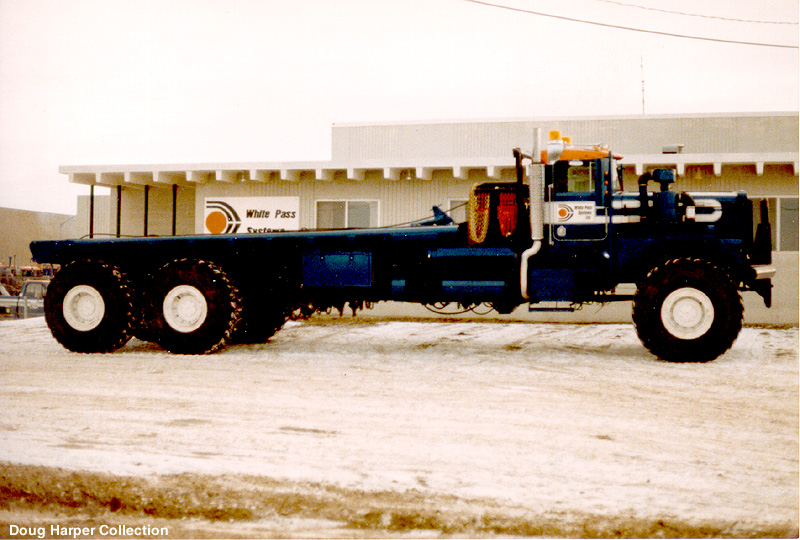 Thats a winch truck for moving skid type equipment. The tires are so large due to the very heavy loads they are able to move around. When we would move a drilling rig in or out of a location, a winch truck was used to move various pieces around location for cleaning or assembly. There is a winch or most likely two right behind the cab of that truck and a tail roller on it. They drop a loop of heavy cable down around the end of the skid mounted equipment, pick it up and pull it up over the tail roller until it heavy balances. Then they drive to where they want to put it and slack the winch off. Really neat to watch!