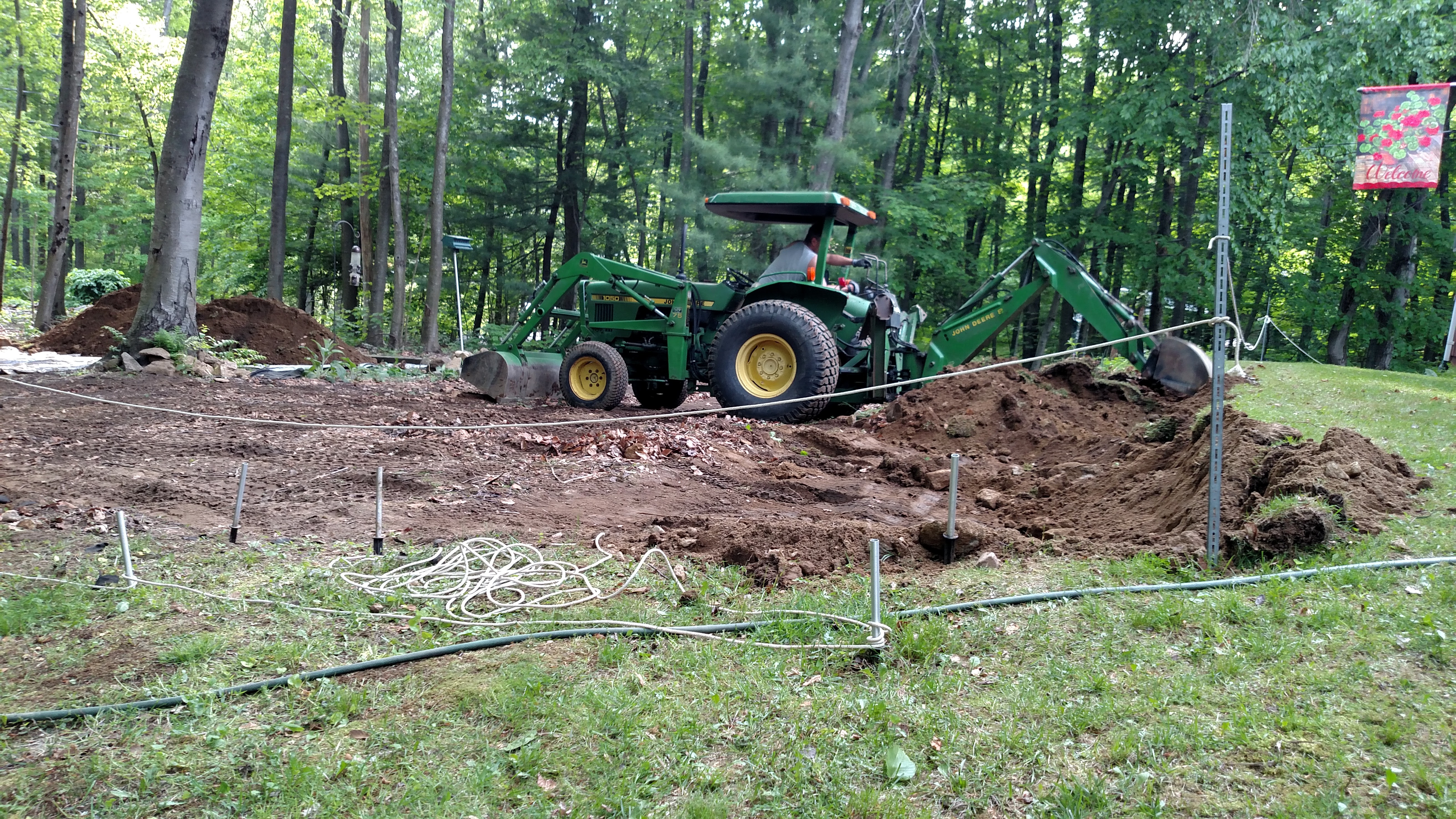 I was going to terrace the area, building rock walls (harvesting all of the rock from our property to save $$$). When I started cutting into the slope though, I realized how easy it was to use the backhoe to cut from the top of the slope and then use the loader to remove the dirt. Once I started, I cut down so that the slope is level from the top to the bottom, thus negating the need to terrace. Now I need to figure out how to smooth and level this area out. I am not that good at leveling with this JD 1050. Any advice?