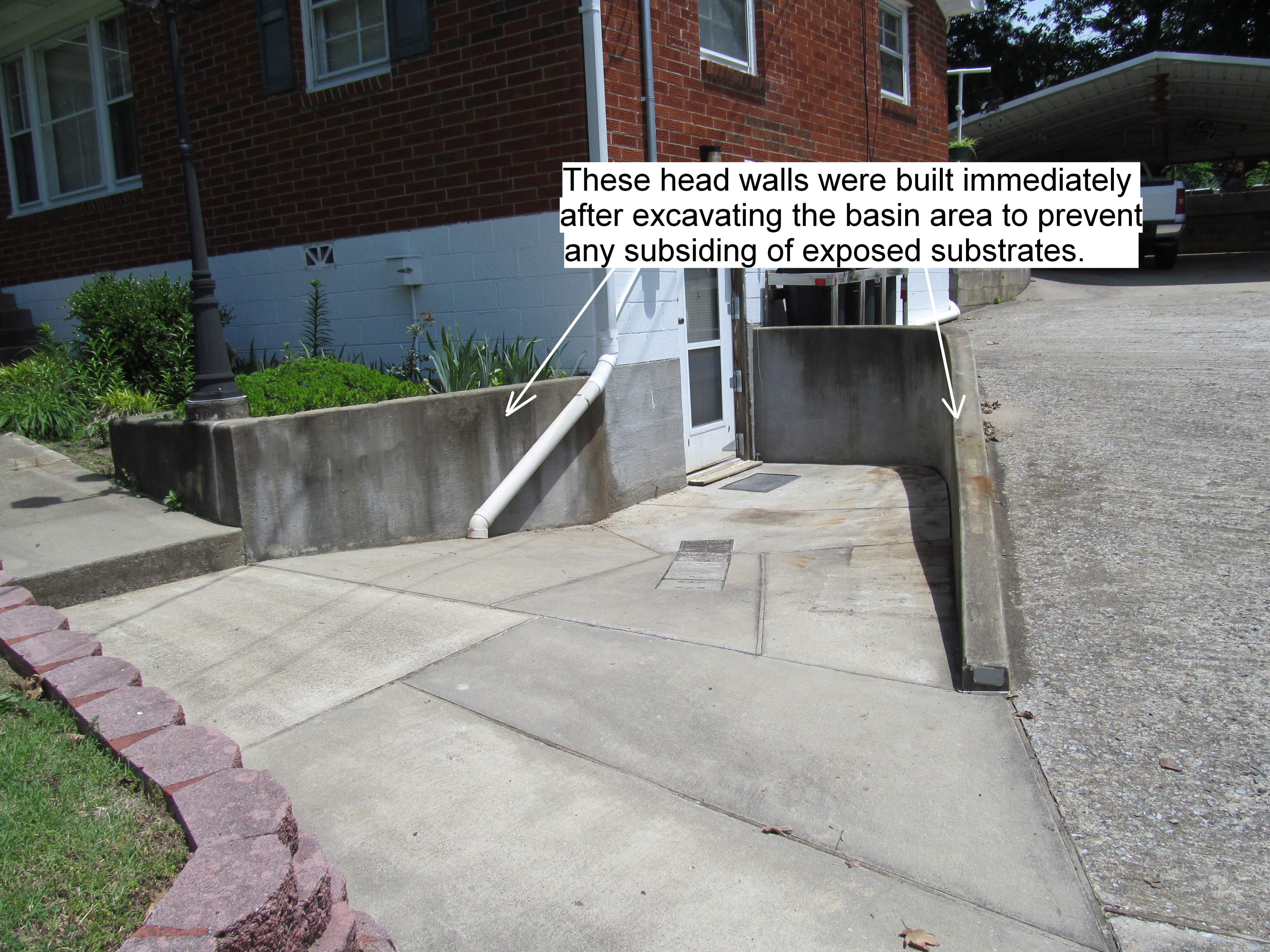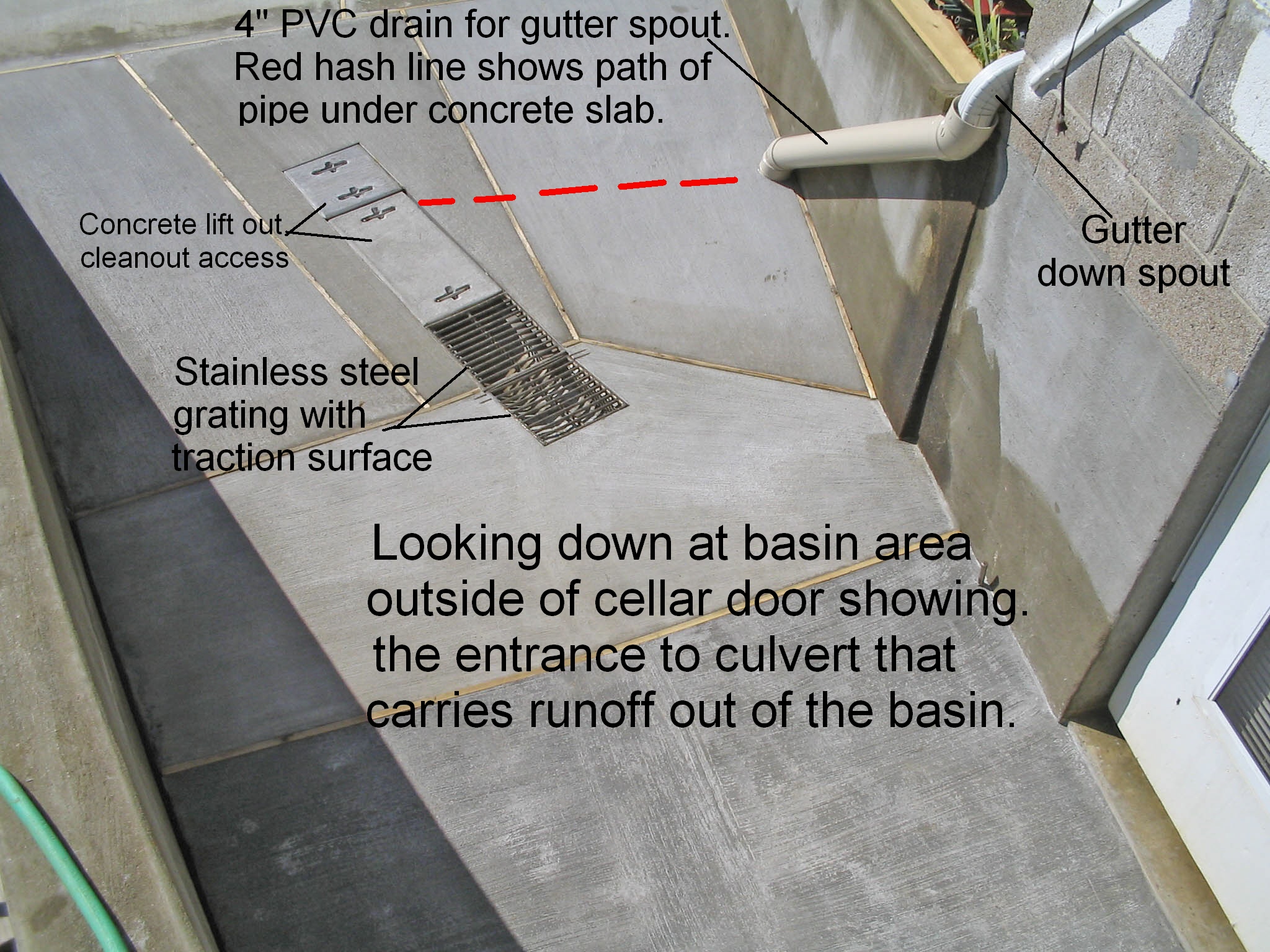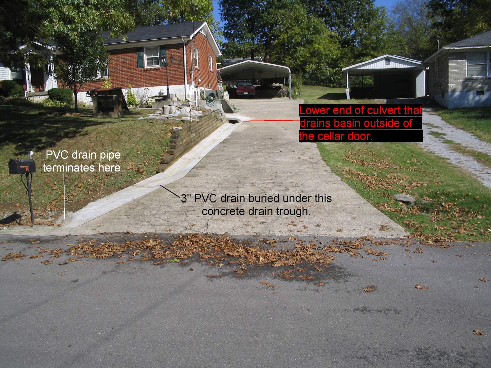 The area outside the cellar door was then enlarged to about 15' X 10'. I installed a drain culvert to carry away rain and runoff from the gutter downspout to a concrete trough I made above the filled in trench next to the driveway.
