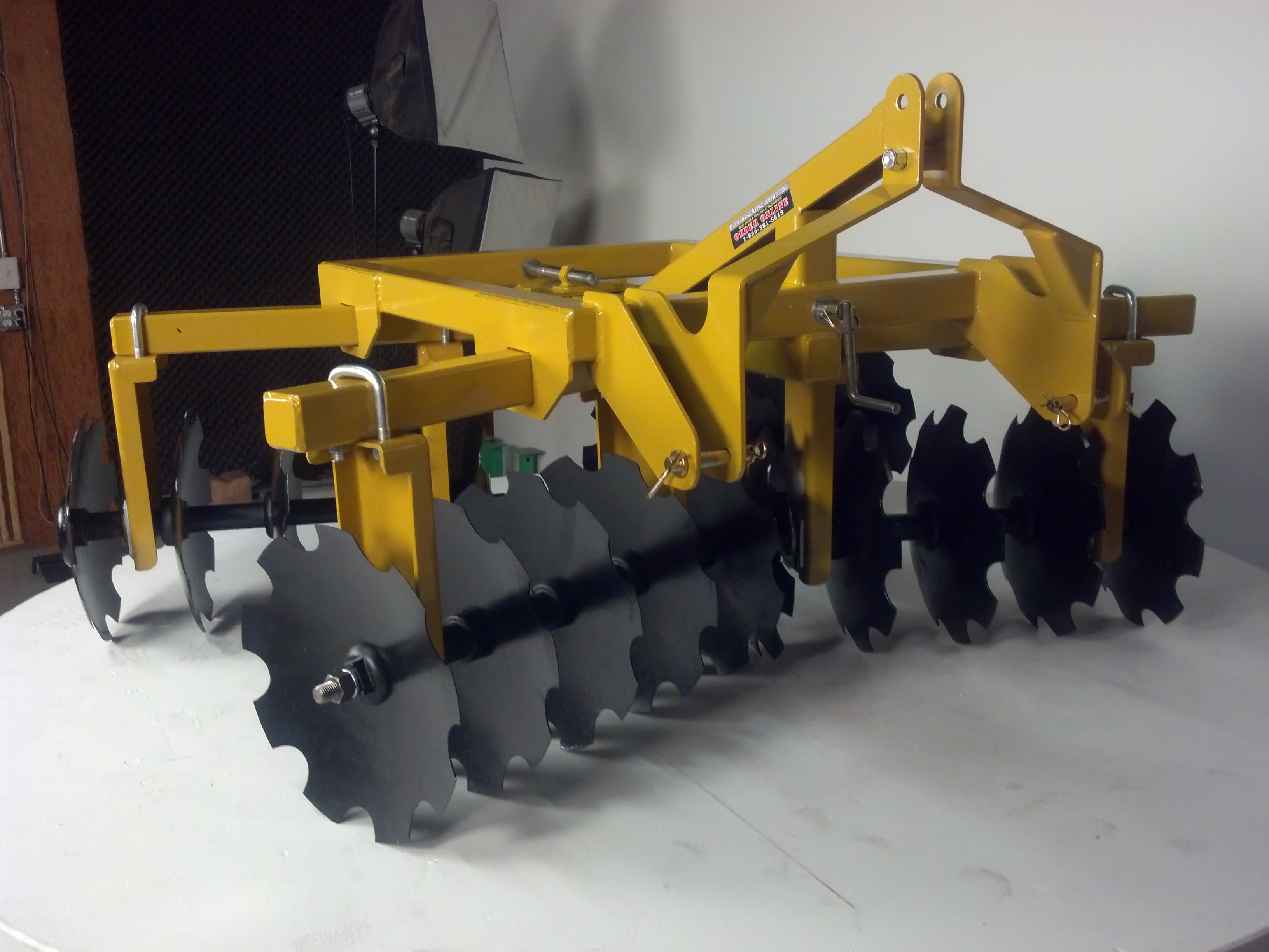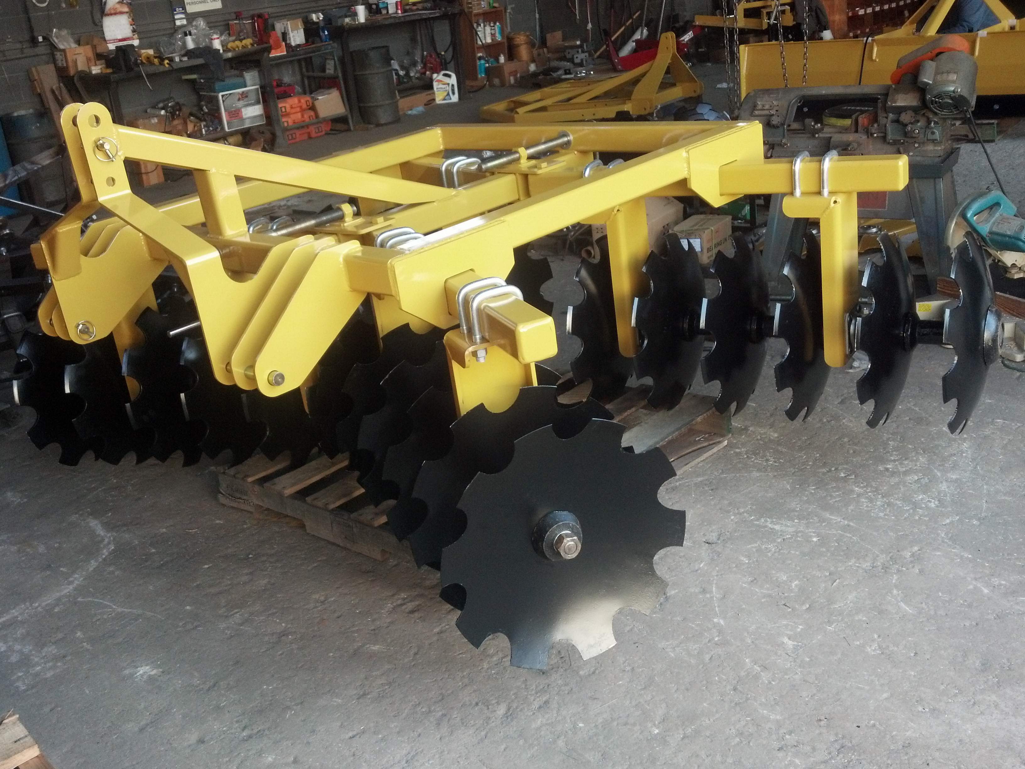 Here are some pictures of our new compact disc harrow, it has 12-18" discs, and is meant for a small compact tractor. We used our 45 HP class 3 Bobcat tractor to see if we could tear it up, as we have made some new design improvements over what we have been selling for a small disc. We are using greased roller bearings instead of friction bearings on all of our Everything Attachments discs, we have 4 models designed with this being the smallest one. The 12 disc model has a narrow hitch for subcompact and small compact tractors, it comes with 16 or 18 inch discs, only one angle setting, which is the most popular one, 21 degrees on the front gangs, and 14 degrees on the rear. More thought went into this than you think, and we will explain with a short video when we post on Everything Attachments for sale. All we lack is painting it now, and photographing it to post on our site.