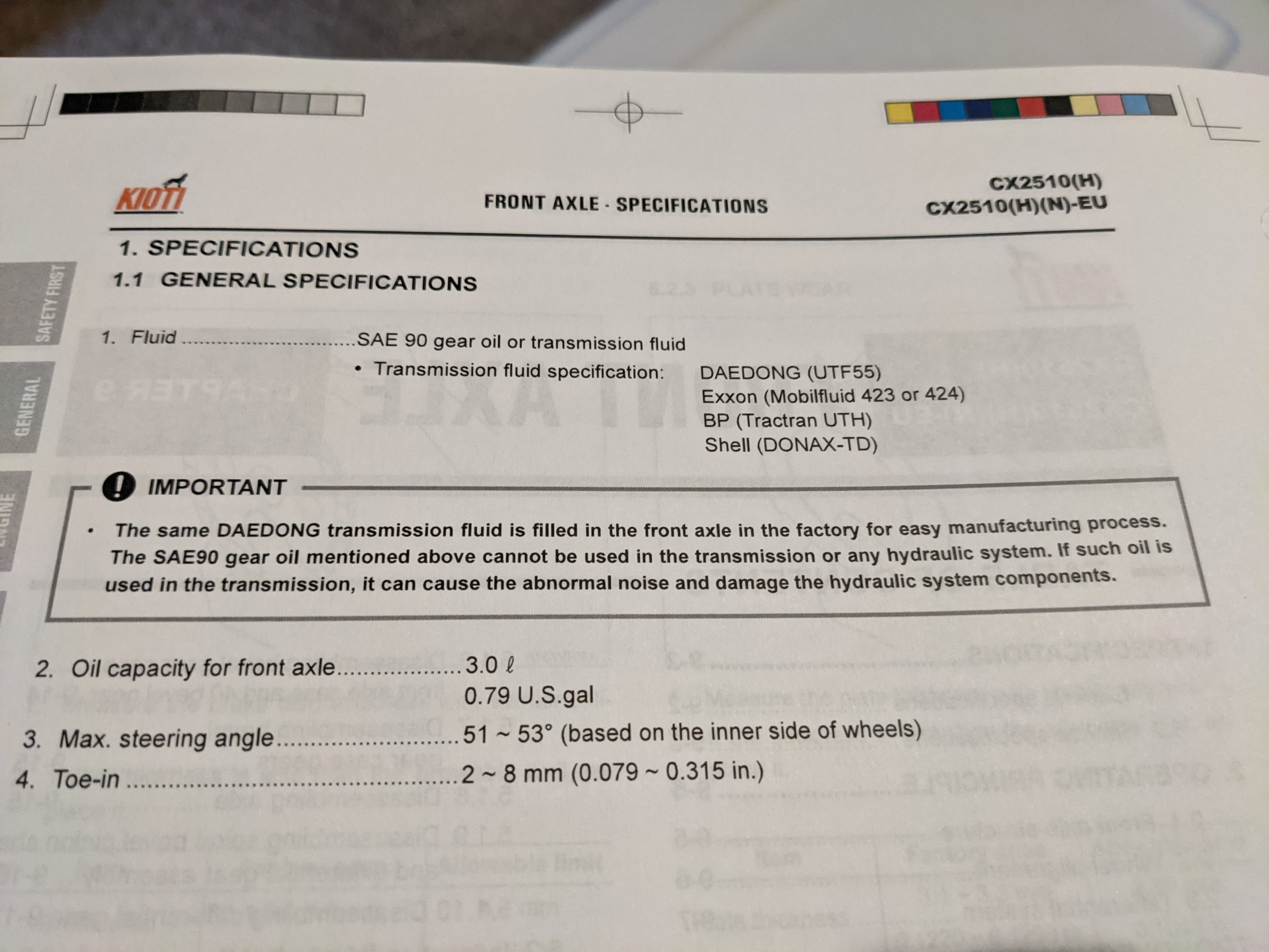 I just started my 50 hour services. I changed the engine oil and filter and drained and refilled the axle with 80w90 gear oil. In the above video of the Orchard Hill guy he mentions the axle is filled with hydraulic oil from the factory and that it needs to be changed out with gear oil at 50 hours. I thought this strange but sure enough that's what was in there. While I was looking for the axle capacity (3 liters) I found this warning in the service manual.