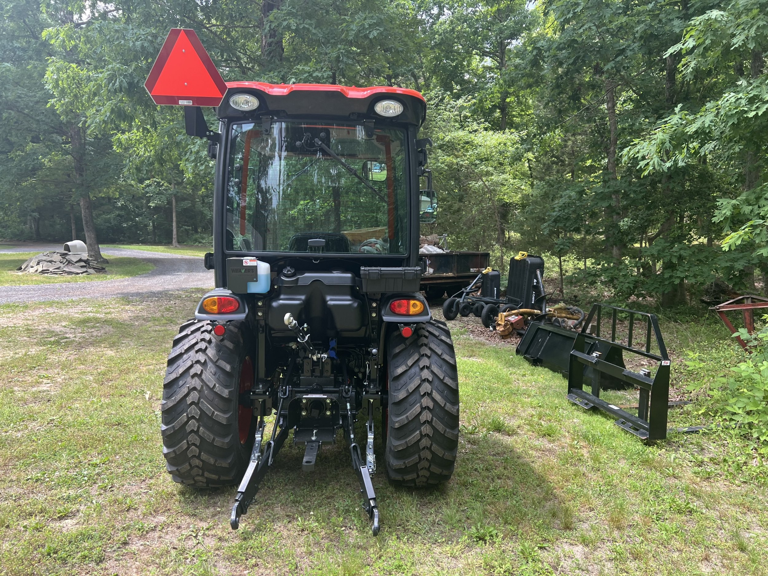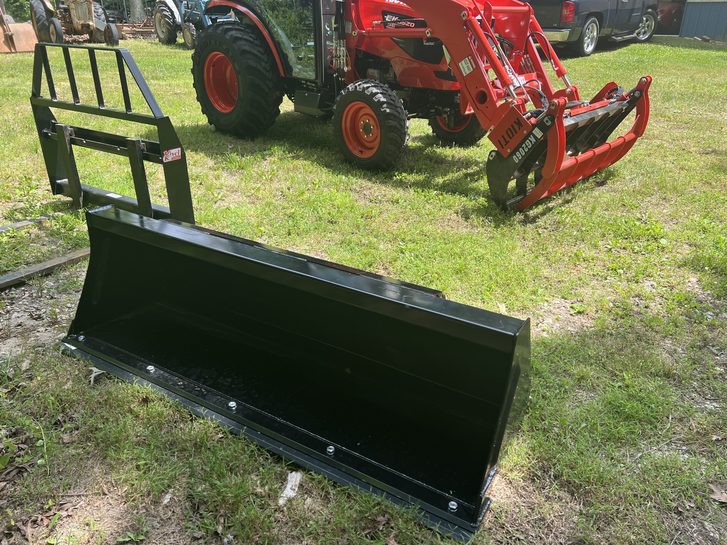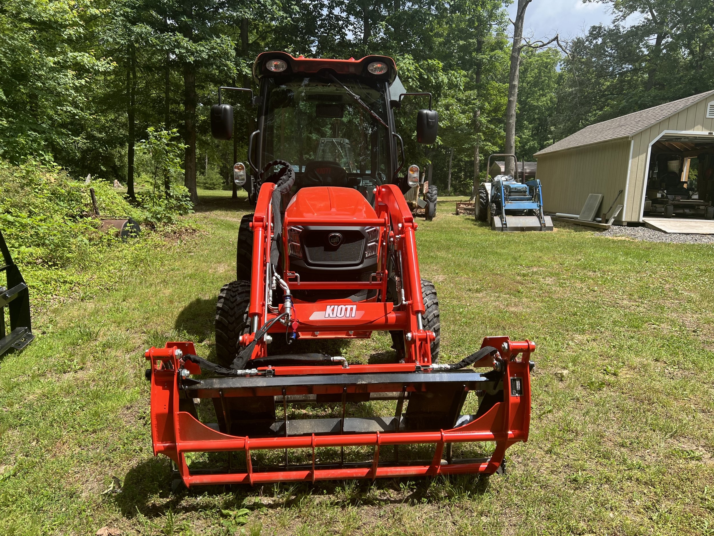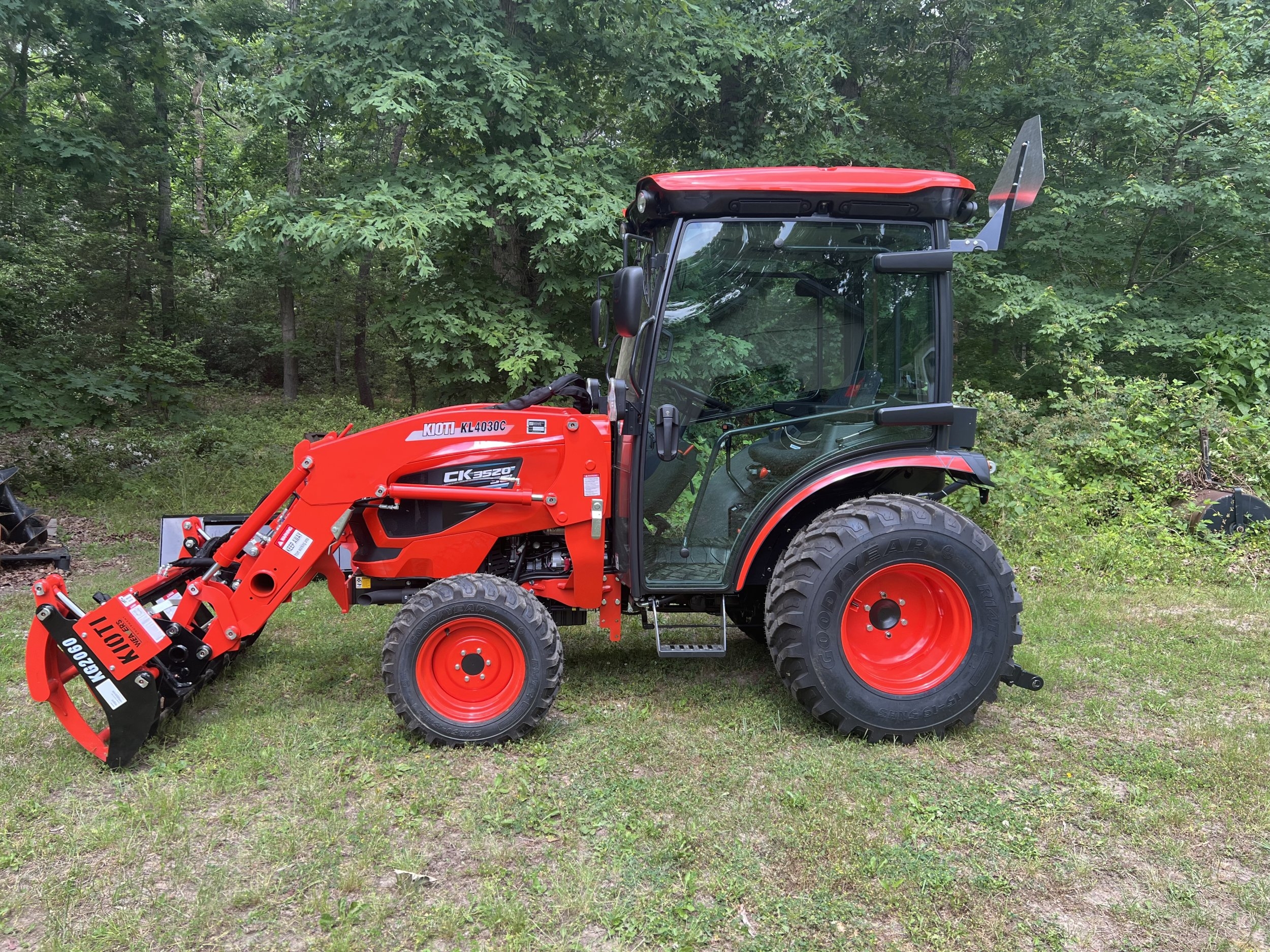 I took delivery today of the first new tractor I’ve ever owned. It is a Kioti CK3520SE HST Cab. It has the KL4030C FEL with a 66” bucket . I also bought a set of 2000 lb forks and the KG2060 grapple. I had RimGuard added to the rear tires. I also bought a hydraulic top and side link. The top and side link aren’t installed yet. I went with the R14T tires. Really excited to finally get a piece of equipment that isn’t already worn out