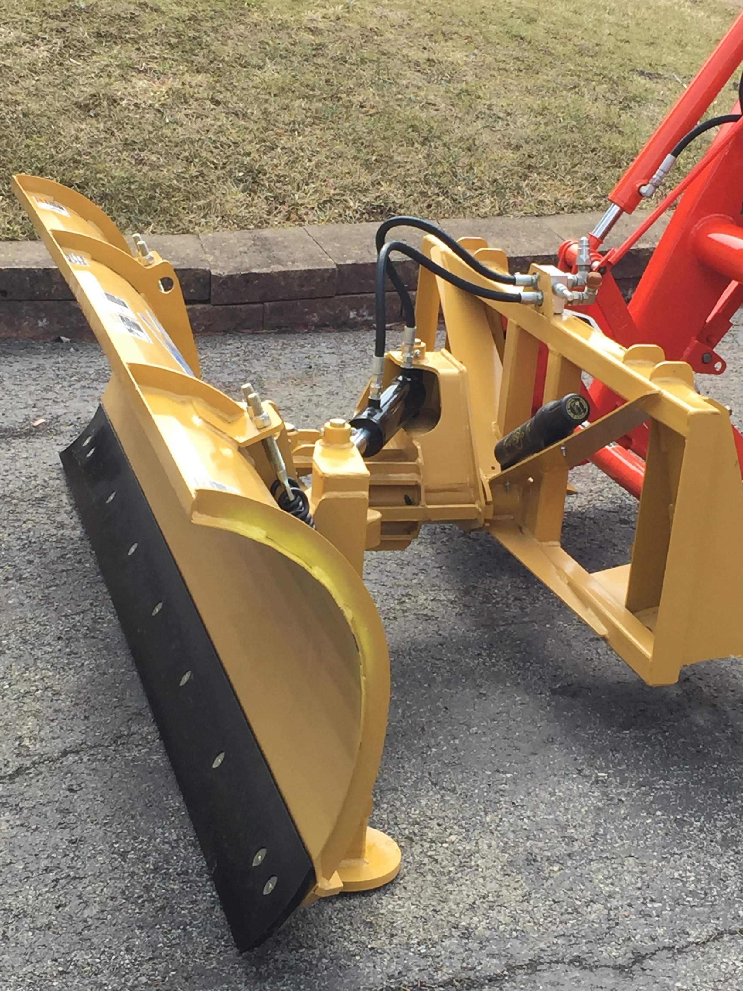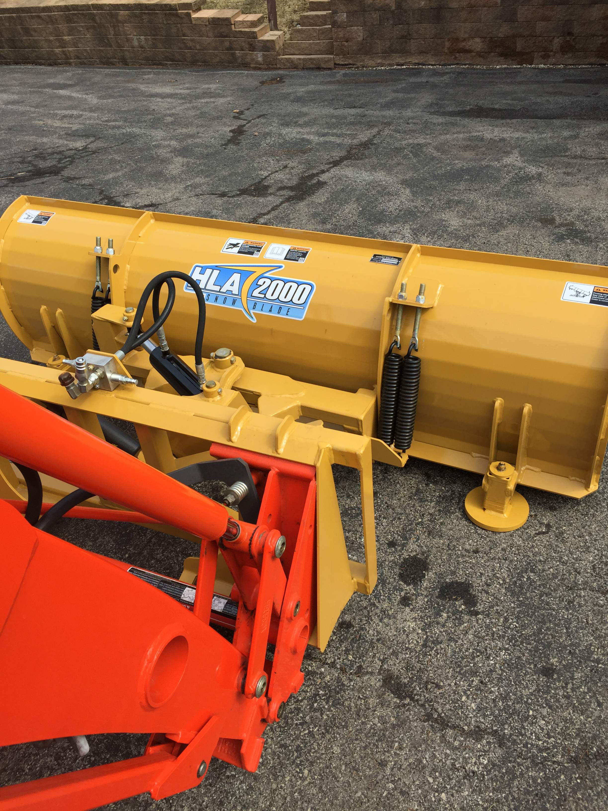 OK so the dealer brought over my new HLA snow plow this morning and we took off bucket and hooked up the ssqa snow plow. Dealer wanted plow onto tractor so he could measure the length of the two new hydraulic hoses to be made up.The feature of the lateral float system is quite the bomb, it allows the blade to follow the contours of the ground. Everything is heavy duty steel, unlike some of the tinny snow plows that I looked at before I ordered this one.I adjusted the skid shoes so plow cutting edge is about 1" from ground, pick up hoses in day or two and install, be all ready for the snow in about 7 months or so,lol,lol. Thanks guys for the feed back.