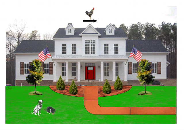 I like the rich, red colored door. A colored sidewalk could be used to draw the eye in.
