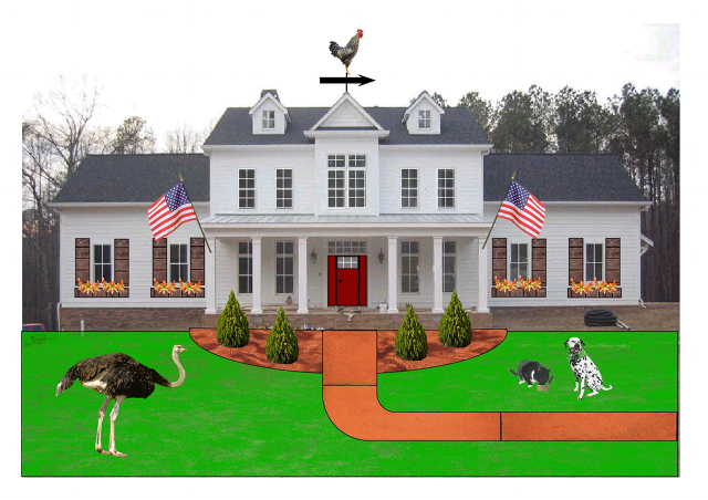 Too bad you couldn't find pink geraniums, but I guess with the ostrich on the lawn it kind of takes your eye away from what color flowers are in the window boxes.