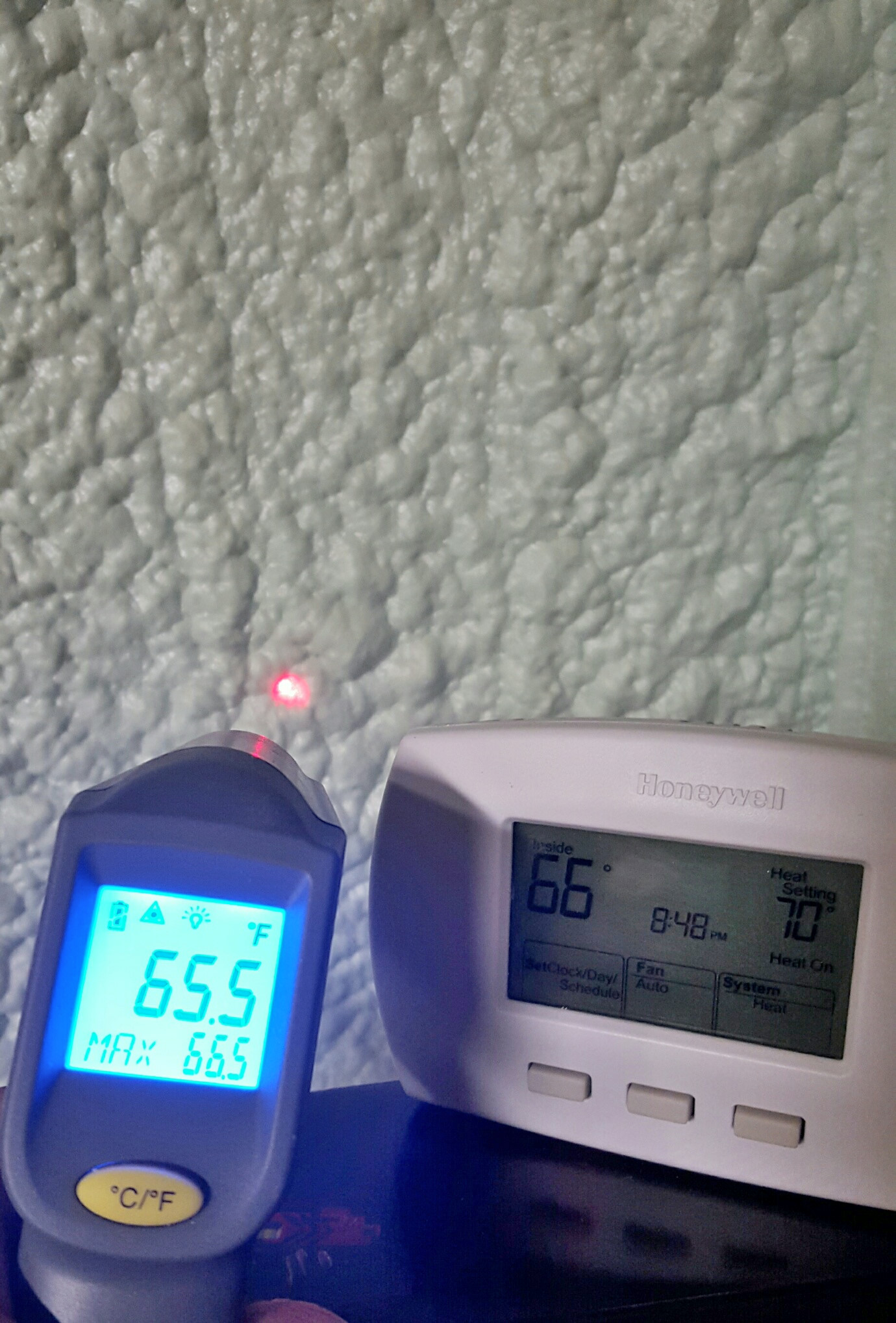 Here's one more example. The below pic is an outside wall with 2-1/2" of closed cell spray foam. Under the foam is OSB sheeting and vinyl siding. Outside air temp is 29 degrees when pic was taken. Inside air temp was 66 degrees.