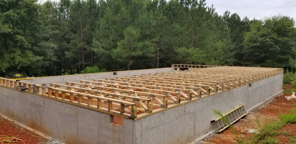 Told you it would be slow. But finally an update. A couple neighbors came over a few weeks ago and helped set the LVL floor beams. A friend came today and helped set half the floor trusses.