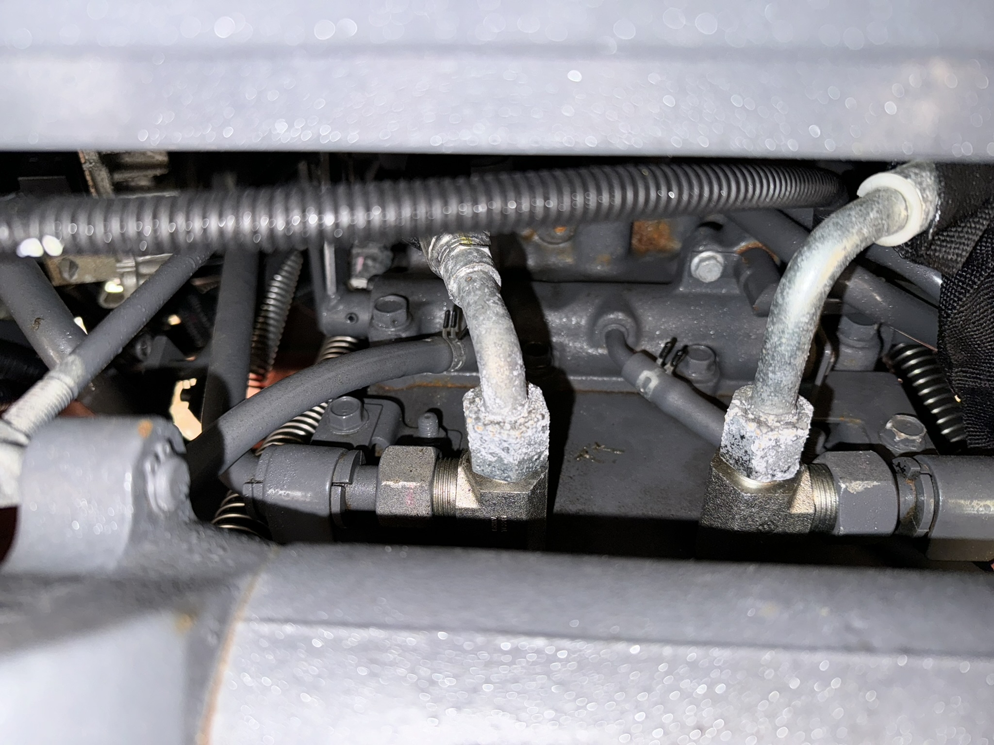 Some of the fittings say China right on them. I'm dissapointed and will now go and try to steelwool/oil all the parts, but what a waste of time. Here are pictures of the hydro connections for the FEL, under the cab and for 3rd funtion valve. I took these pictures a few weeks ago, on a warm morning. You can see some droplets from the humid air on the cold metal. Notice on the middle picture on the cab, some connections have zero corrosion, but most have the oxidation. I really expected more for the money spent on this. Any thoughts or insite? Thanks!