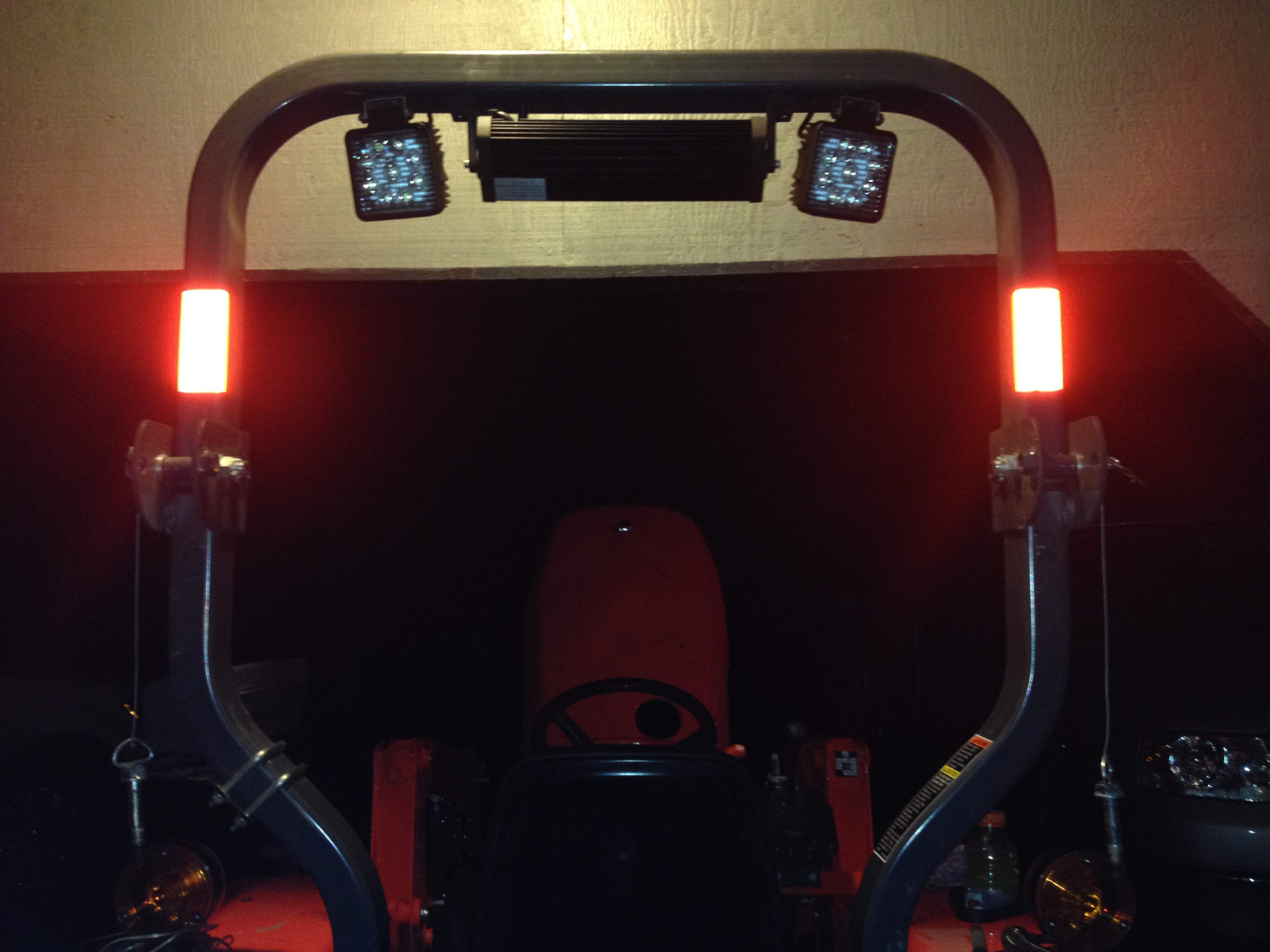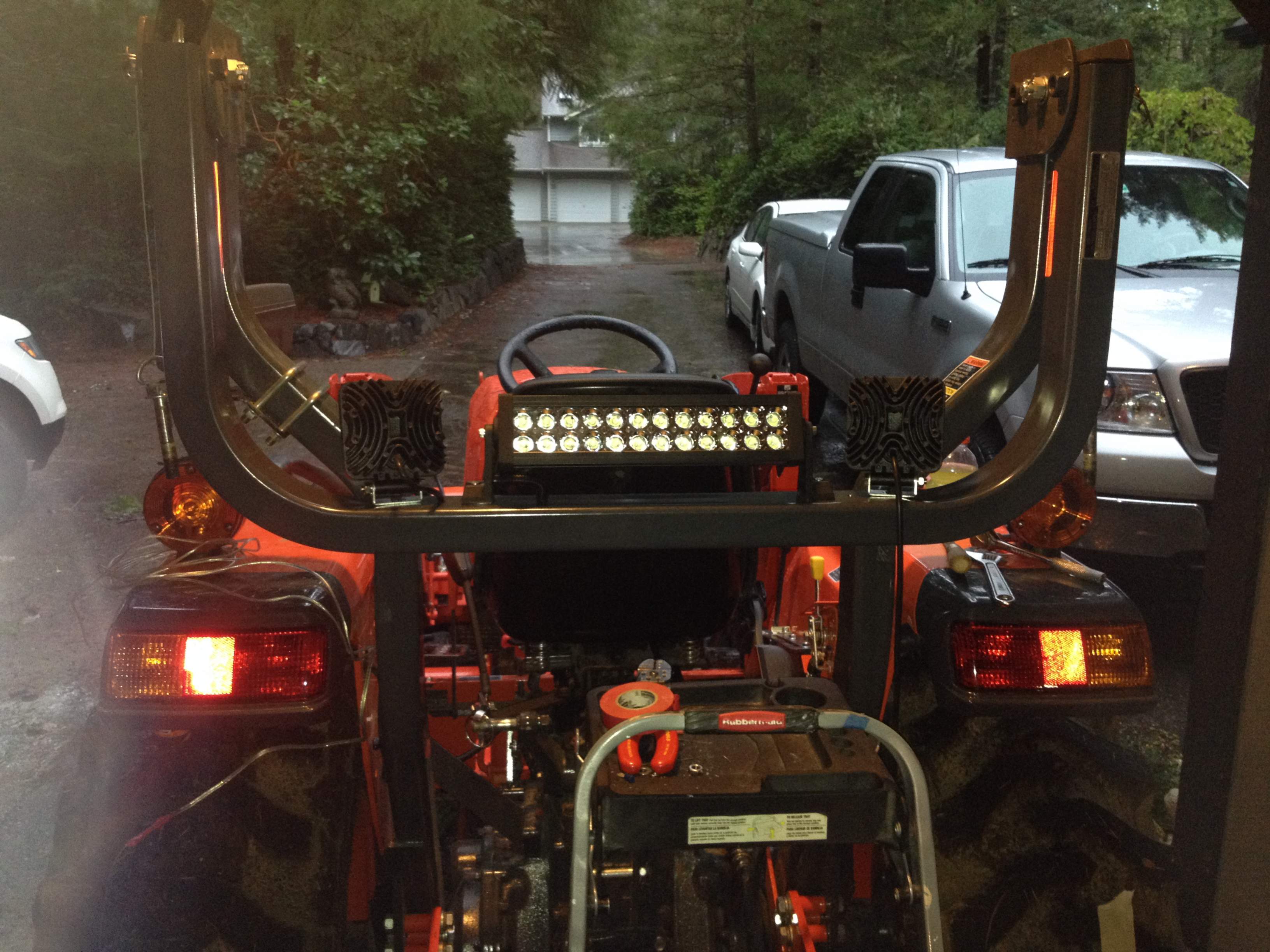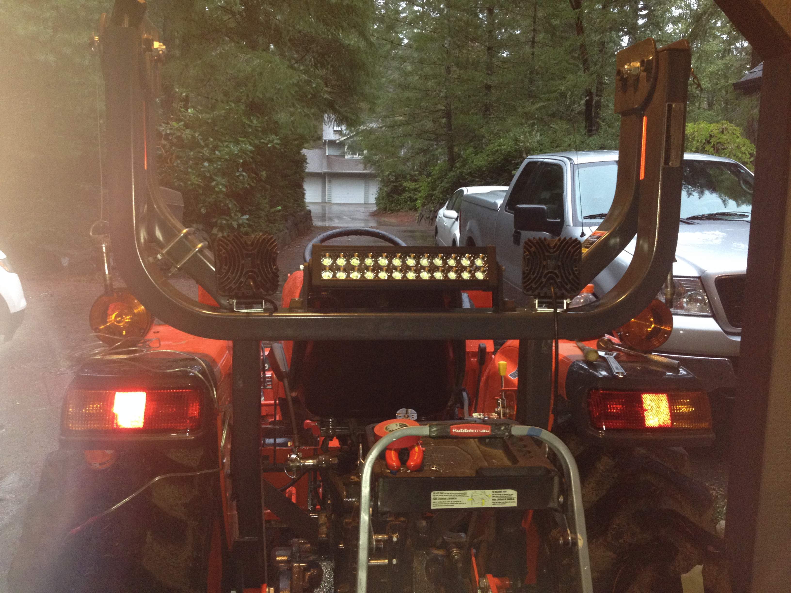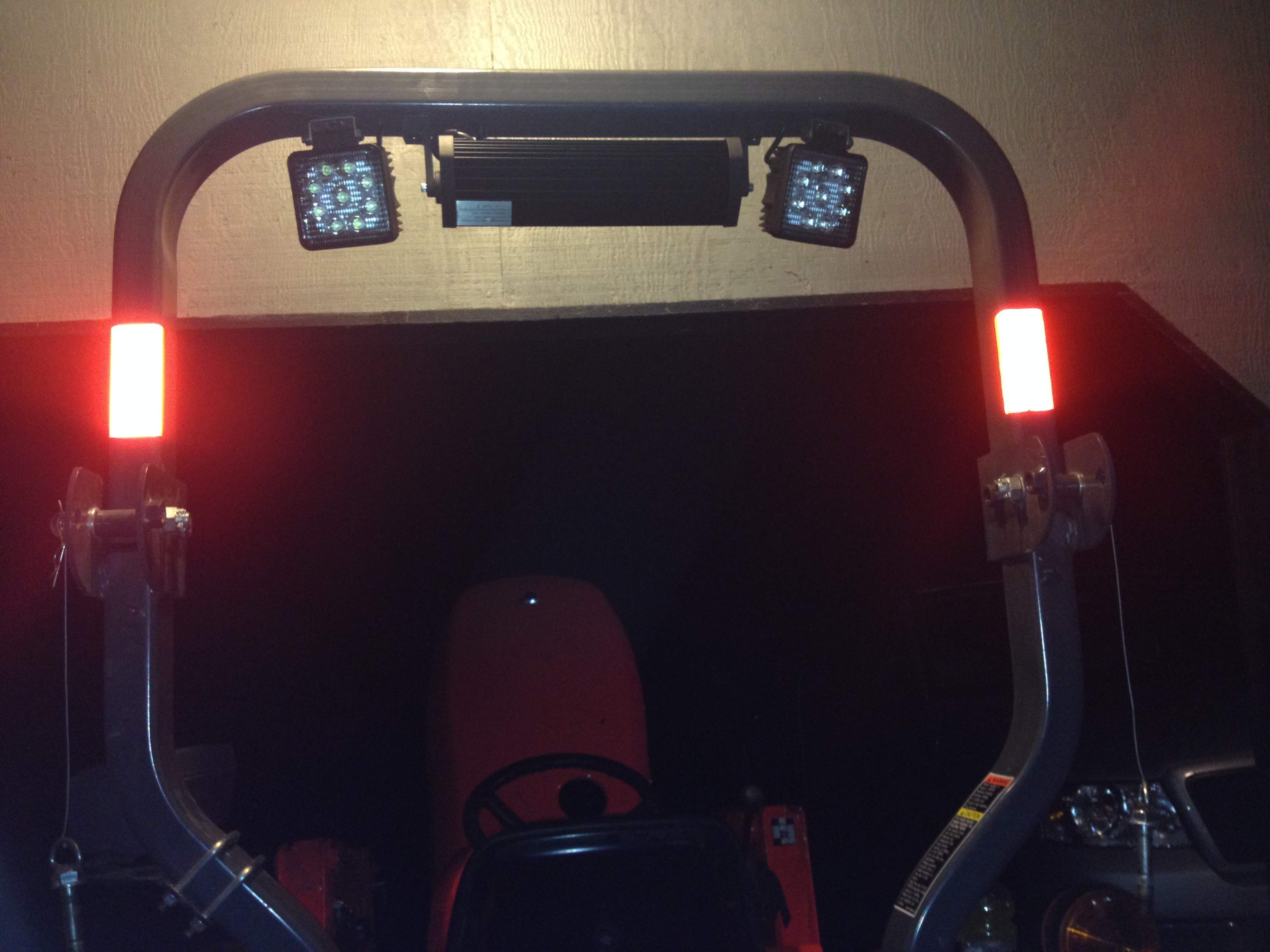 Undoubtedly you all have seen some beautiful custom light jobs here on TBN. I went with the fastest set-up that I could install in a short period of time. My installation wasn't beautiful, but works. But if one is using the tractor in a wooded area, get used to the damage incurred. Thus I'm glad that my setup was spring mounted so they givea bit when clipped by a branch. I don't care how many branches that one prunes, there is always one more somewhere that catches 'em be they mounted over, under or beside the ROPS. :2cents:
