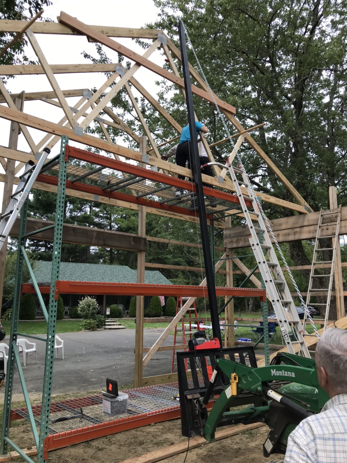 The scaffolding is pallet racking I bought used off of Craigslist. I knew I wanted shelving at the back of the shop to store my tractor implements vertically on pallets - bucket, snowblower, tiller, forks and snowplow. I figured I would buy it in time to use as scaffolding. We mounted it on 2x10 skids so we can move it around the inside of the barn to set the trusses with.
