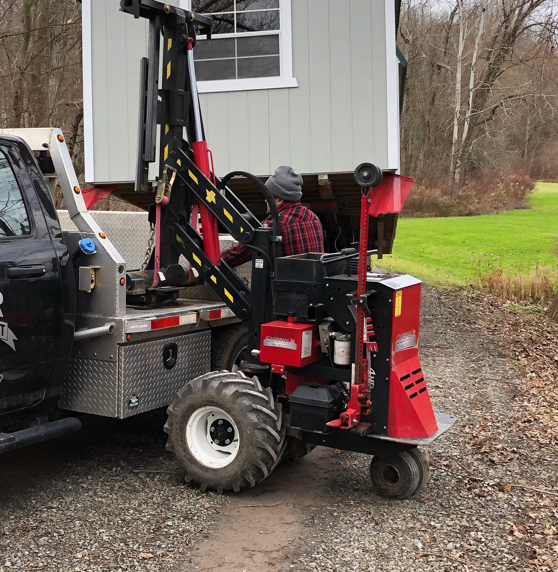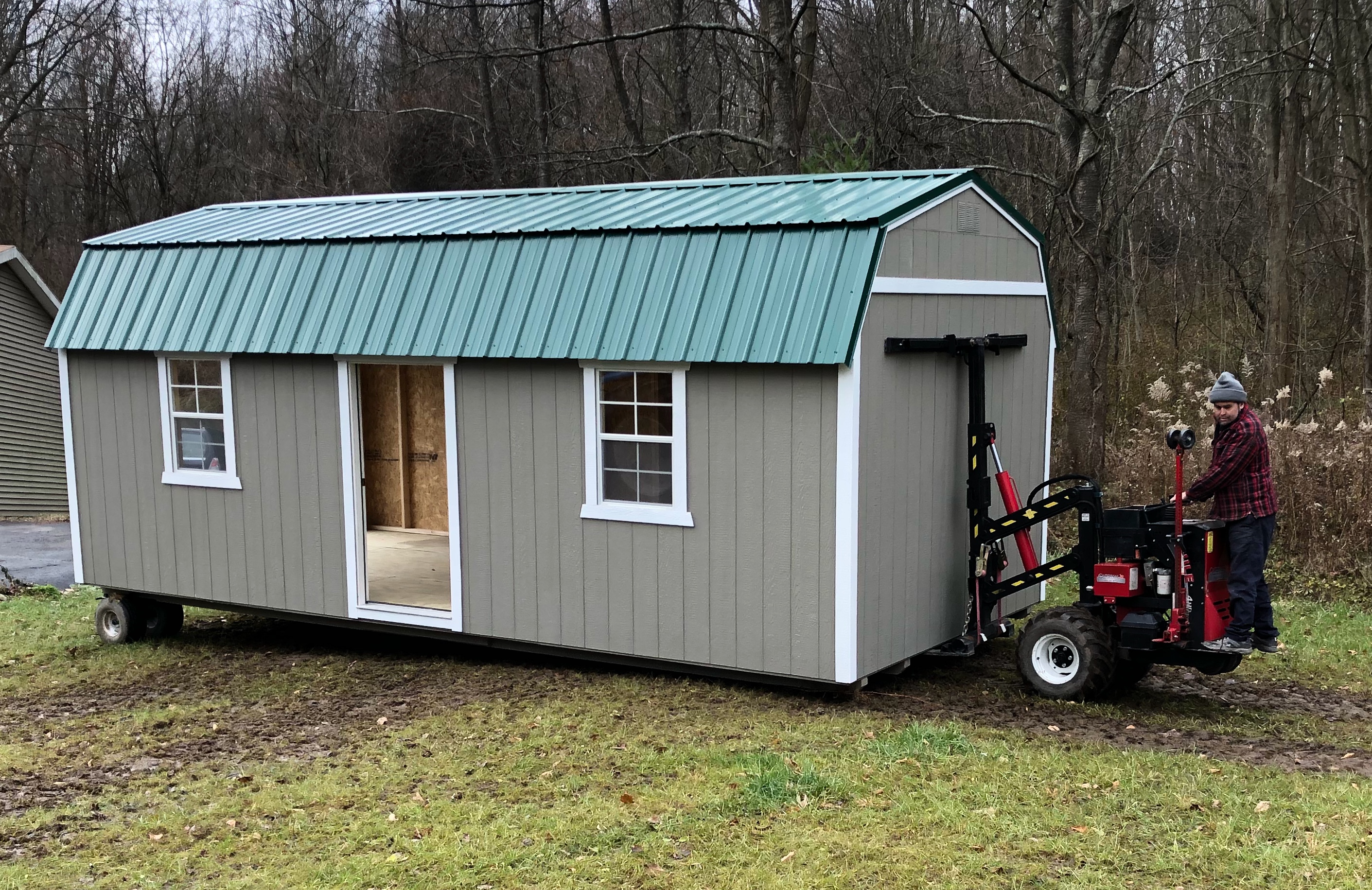 He pulled the shed the rest of the way up the driveway, across a very wet lawn and onto the pad I had made easy-peezy. I was really pleased the way things worked out and was amazed that one guy did the whole job of placing it. Here are pictures to prove it happened.