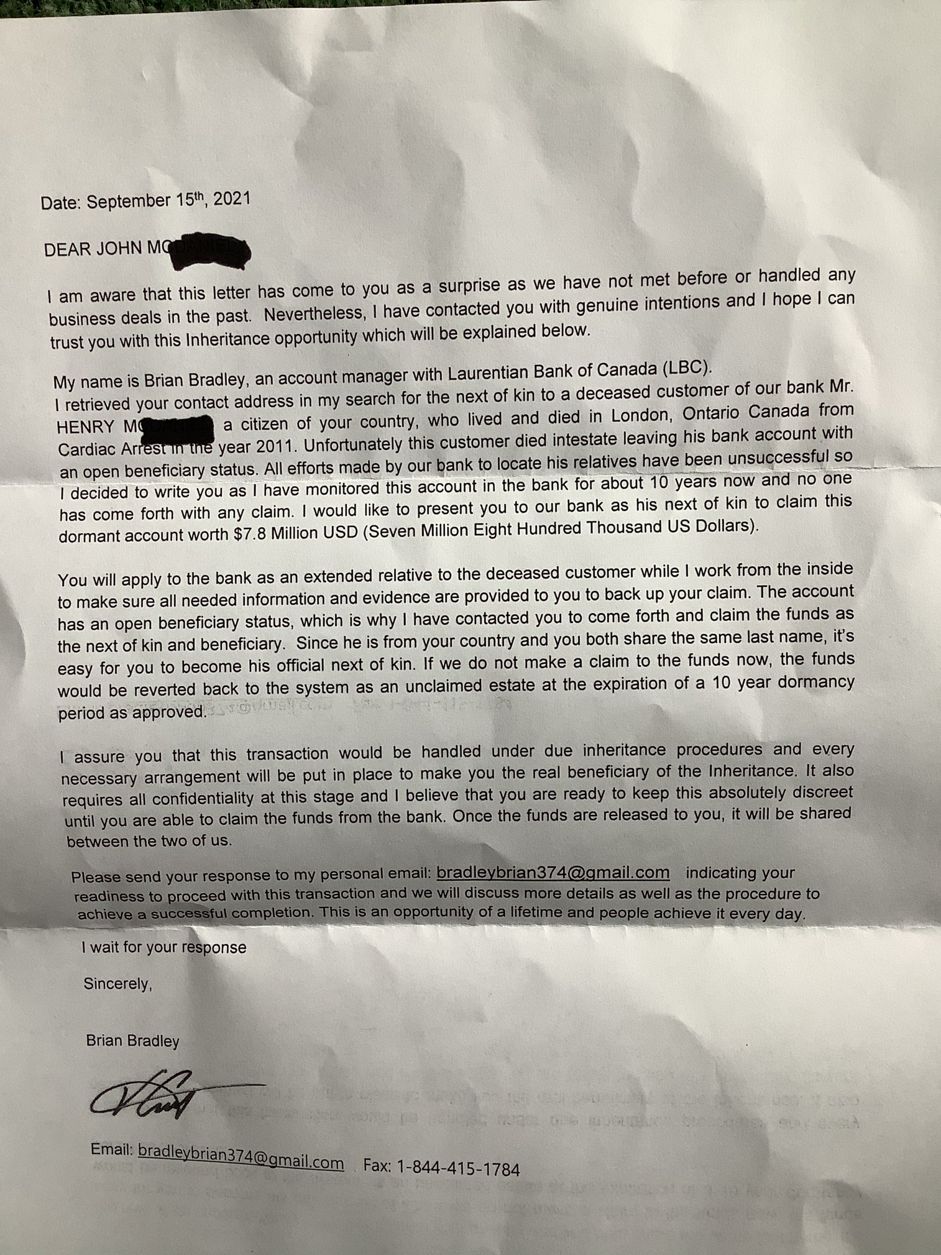 In other words, if you did not pick up on the fact that this is a scam earlier in the letter...how many multi-million dollar estates are left unclaimed?