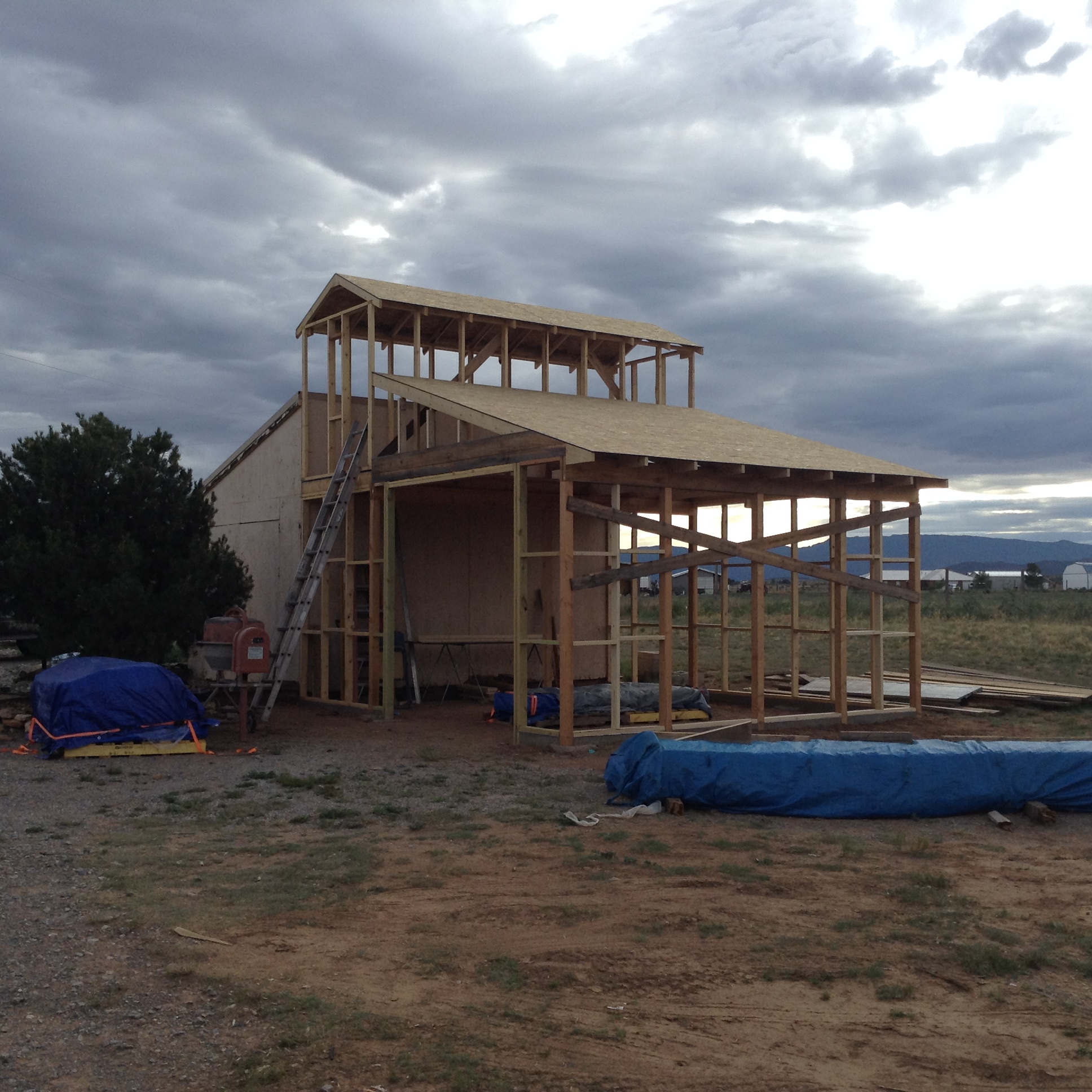 Started building a new "tractor house" as an addition to our shed. Area for tractor will be 12x20, area of 6x20 for work bench / tools. Above the 6x20 will be a storage area also 6x20x78" high. Got all the posts and beams in place, perimeter footer, and framing for 8x8 garage door. Have to go back on duty tommorow for 3 days, (so I can take a break... Forgot how much work it is to frame.... Maybe I'm just getting too old) I won't get a chance to get back on it until Sunday. The tarp was a necessity to get out of the sun... Sure was strong at 7200 ft elevation and 97 degrees for the past 3 days! image.jpegimage.jpegimage.jpeg