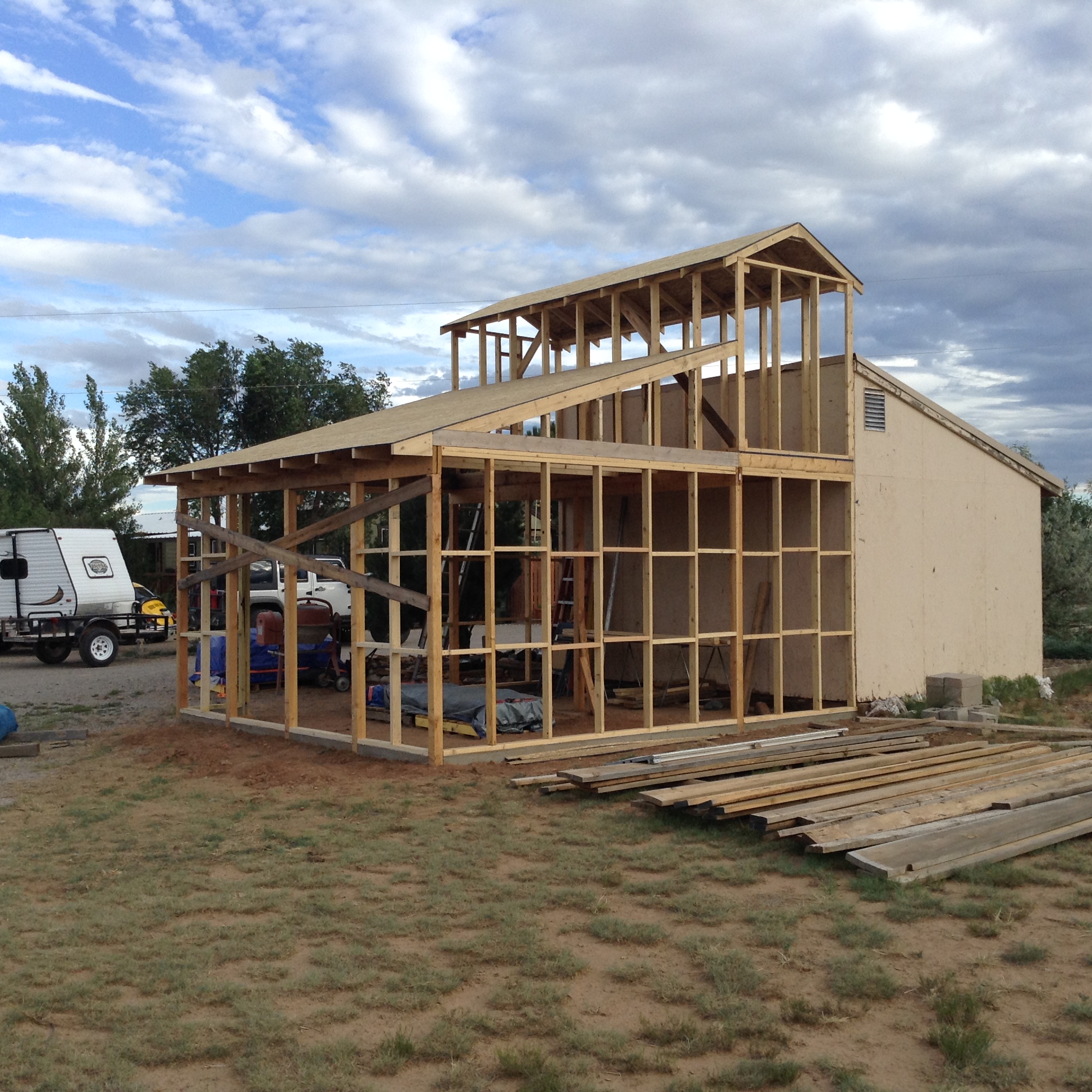 Started building a new "tractor house" as an addition to our shed. Area for tractor will be 12x20, area of 6x20 for work bench / tools. Above the 6x20 will be a storage area also 6x20x78" high. Got all the posts and beams in place, perimeter footer, and framing for 8x8 garage door. Have to go back on duty tommorow for 3 days, (so I can take a break... Forgot how much work it is to frame.... Maybe I'm just getting too old) I won't get a chance to get back on it until Sunday. The tarp was a necessity to get out of the sun... Sure was strong at 7200 ft elevation and 97 degrees for the past 3 days! View attachment 515252View attachment 515253View attachment 515254