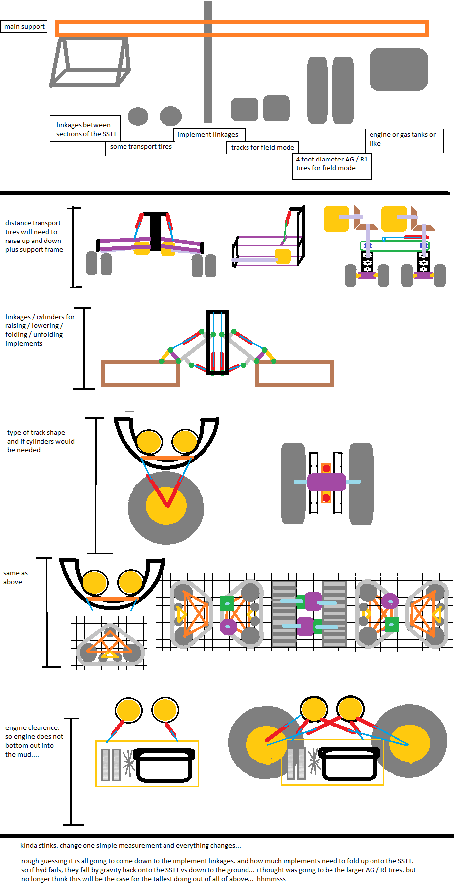because of such a wide range of what might attach to the SSTT. at moment. i am more inclined to see about getting some 3D models / variations going just of the SSTT. and then build upon them. to see how various things would attach. and redesigning things that would allow the switching easier overall. it is the full concept of more likely being able to attach things on both the front and rear of the SSTT. vs current age tractors and harvesters that only attach to the rear or front of the machine. without a major few days of changing things over to get the more complex things setup...