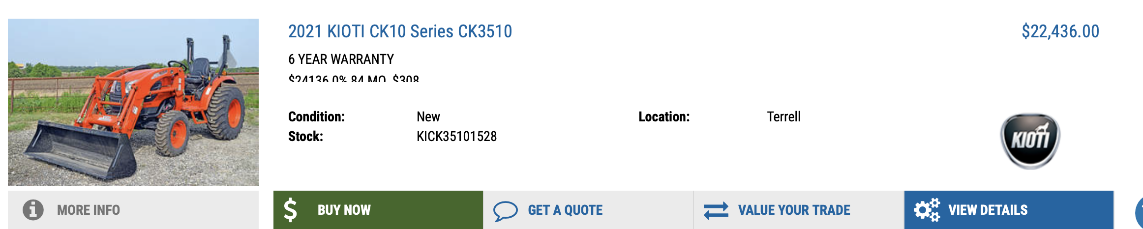 I have a Kubota and Yanmar dealer 5 minutes from my house and one of their other locations 28 miles away also sells Kioti. I recently received the following quotes