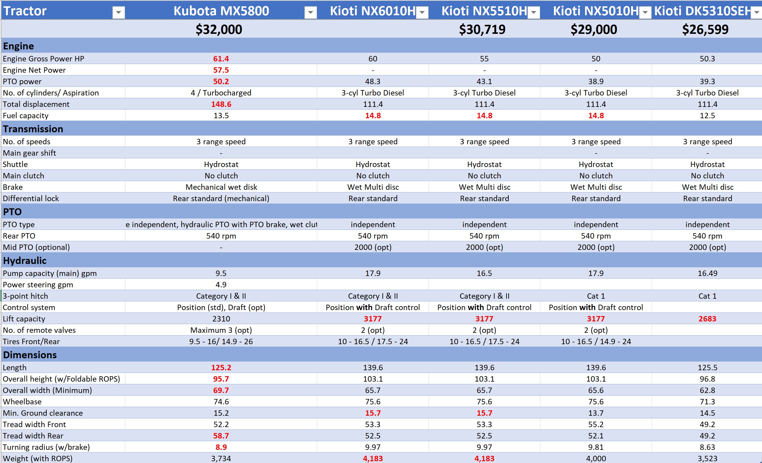 In your spreadsheet the Kubota MX5800 is $8.57 per pound, the Kioti NX5010H $7.25 per pound, making the Kubota about 18% premium. Other tractors between these extremes.