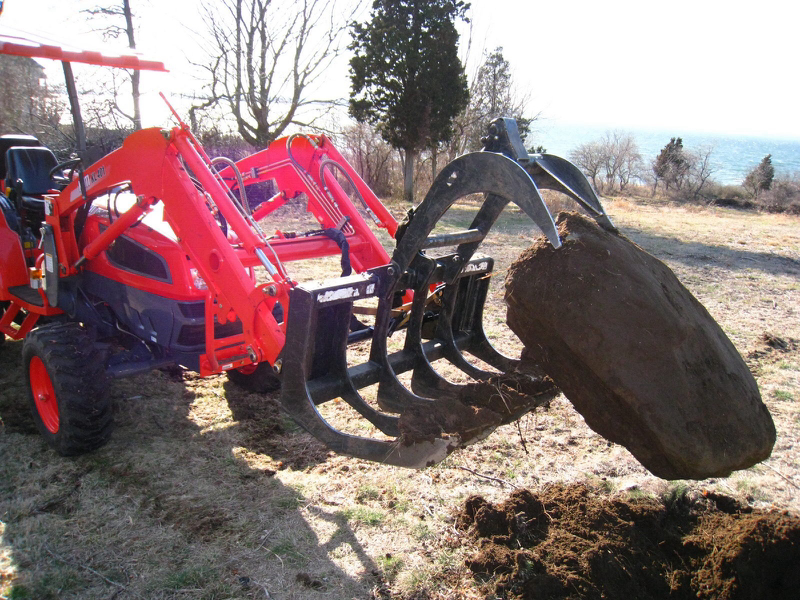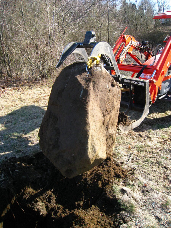 In that positive vein, here is a photo of the rock I pulled out of the ground. It was sticking out about four inches or so I I kept hitting it with my flail so I decided to grab it. I had no idea how big it would turn out to be. The grapple hooked on just with one tine on top and that tine got splayed out if that is any indication of how heavy the rock was. The grapple held though and I literally just lifted the rock out of the ground (sandy soil). At the time someone asked me to measure it to calculate the weight. I forget the actual measurements but I recall the length was about 42" in the longest dimension. Again, just going from memory, based on the density of granite, it weight something north of 2000lbs and south of 2500lbs. I don't think I could have lifted it without the BH as ballast. Even then the rear felt very light as I moved it.
