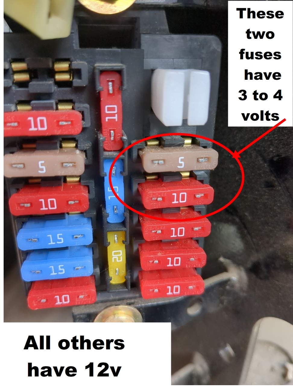 Another oddity is low voltage across the fuses for "Engine control" and "Engine sensor" with the ignition turned on. Perhaps it's normal that sensors run at variable lower voltage.