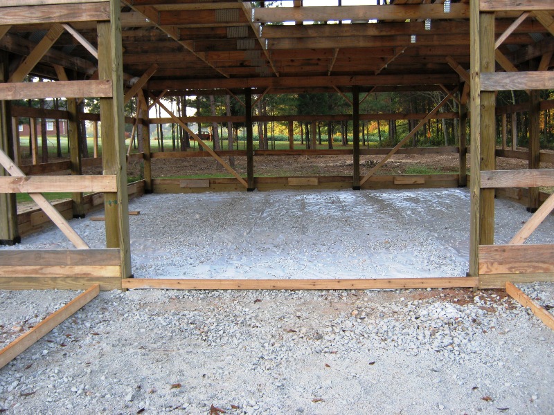 8' OC on the sides. ~10 OC on the end walls. When we first started there was no water on the property, hence the red cans -- there is now.