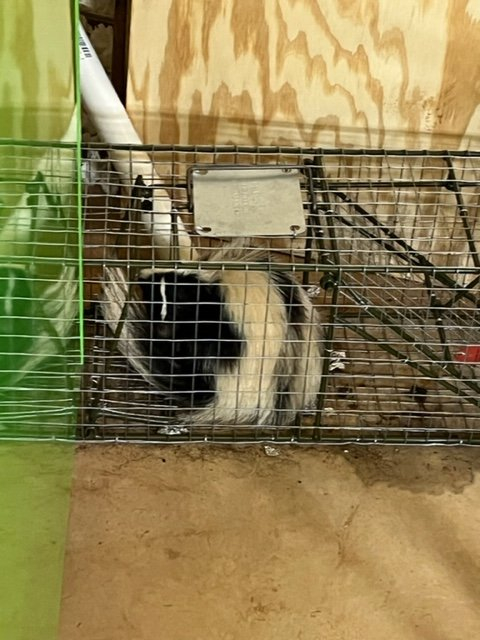 Good luck! We accidentally trapped one in the orchard last fall (trying for the raccoons). The tarp/blanket trick works great. I would rehearse the release part. My live trap turns out to have a terrible latch design that basically takes two hands, with no ability to have a long string pull it open. Fortunately, the skunk was very tolerant of the banging and muttered curses as I sorted out the latch. While it was waiting, it excavated down about six inches through the trap wires. It was rather impressive.